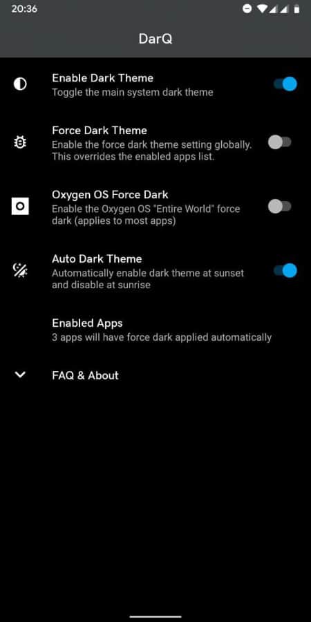 11.02.2020 - DarQ зараз працює без кореня! Використовуйте сценарій ADB з потоку XDA або сховища GitHub, щоб запустити необхідну фонову службу для використання DarQ без необхідності викорінювати свій пристрій.