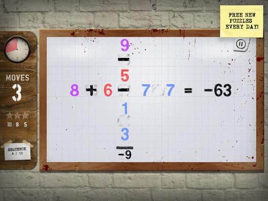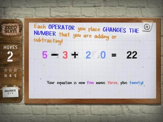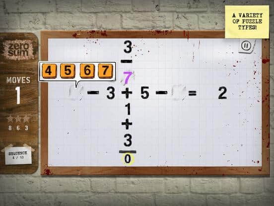 Zero/Sum – захоплююча математична гра для IOS, де ви будете вирішувати різні приклади. Сюжет гри починається з того, що талановитий вчений знайшла ліки від раку, але її вбивають терористи і тепер ви як її асистент повинні відновити всі рівняння. Перед вами виявиться дошка з численними цифрами, вашим завданням буде розставити в потрібному порядку знаки для того, щоб за підсумком сума у прикладі дорівнювала нулю. Вирішуйте численні приклади і проявіть всю свою спостережливість і математичні знання.