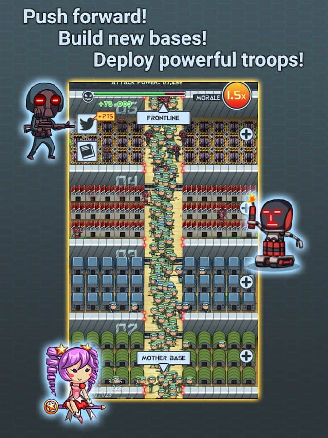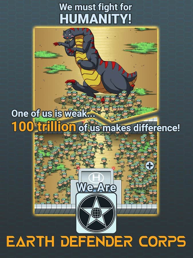 100T Earth Defender Corps – в цій епічній грі вам належить врятувати Землю від неминучої загибелі. Розробіть тактику і зброю і протистоїте ворогові, який вирішив роздобути ласі території. Якась форма життя стала швидко і безконтрольно мутувати, напади на людей почастішали і надія на порятунок всього роду тільки на вас. Організуйте армію і відправляйте солдатів в гарячі точки, послабте противника і нанесіть нищівний удар. Монстри швидко ростуть і поширюються, проте навіть у них є слабкі місця.