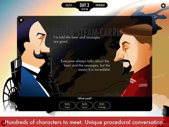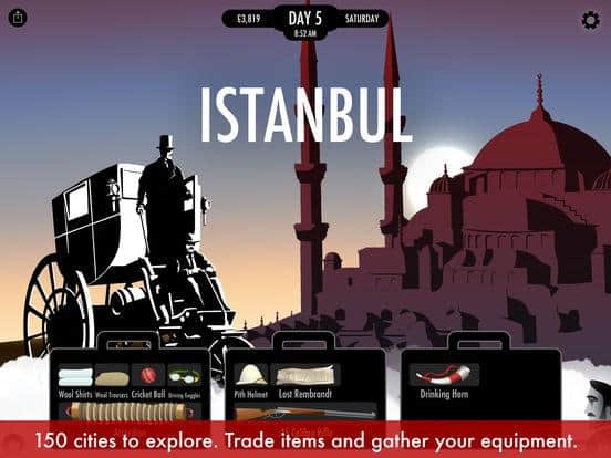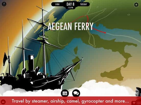 80 Days – інтерактивне пригода для IOS, де ви будете подорожувати по всьому світу і виконувати різні місії і завдання. У цій грі ви будете виступати в ролі камердинера Філеаса Фоґґа з яким відправитеся в небезпечну подорож, перетинаючи міста і країни на потягах, пароплавах, повітряних кулях, човнах, верблюдах, конях та інших засобах пересування. Ви повинні постійно стежити за здоров'ям свого господаря, своїми фінансами і часом і не приймати необачні рішення, які можуть привести ваше подорож до невдалого завершення. Не дайте собі збанкрутує і продавайте товари, які принесуть вам прибуток і не беріть у дорогу занадто багато багажу. У грі ви зможете відслідковувати статистику своїх конкурентів відзначати їх маршрут, а також тріумфи і катастрофи.