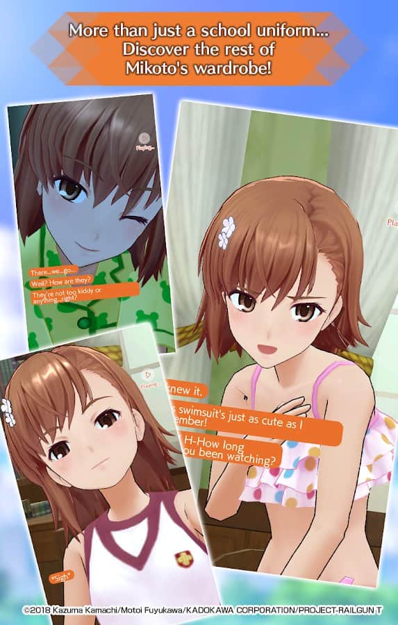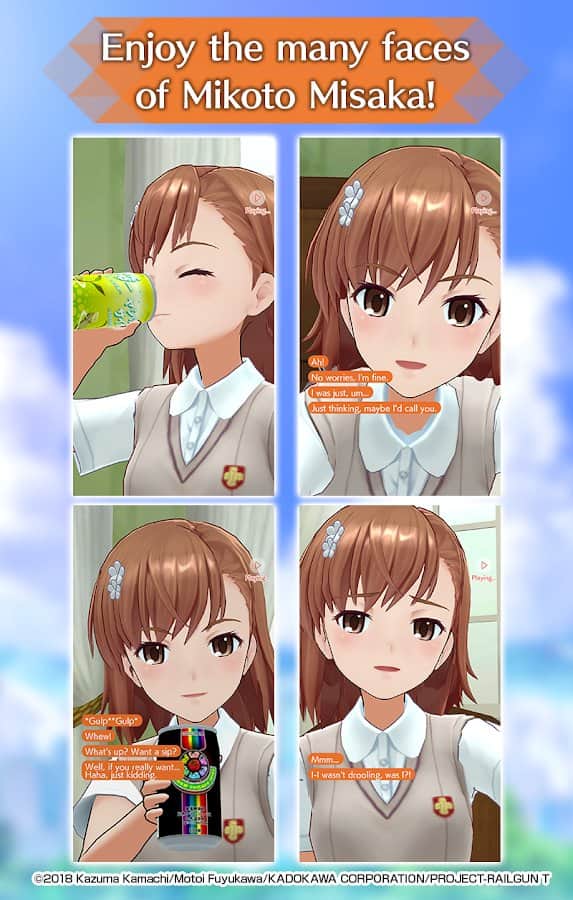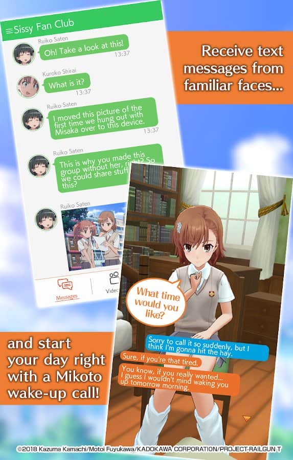 < p & gt; a Certain Scientific Railgun: Spectrum Story - підтримайте зв'язок з Мікото Мисакою і дізнайтеся її ближче! Кожен день листуйтеся і читайте цікаві історії з її життя, а також не забувайте періодично телефонувати і бачити головну героїню в різних образах, в залежності від того, де вона знаходиться. Зачіпайте в діалозі будь-які теми, робіть правильний вибір для розвитку потрібних вам відносин, слухайте деякі відповіді голосом, колекціонуйте фотографії з розмов і веселіться, тепер ваше оточення стало ширше на одну віртуальну подругу.