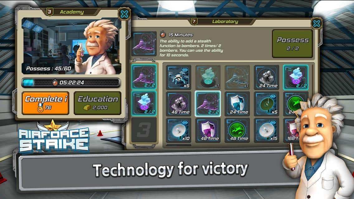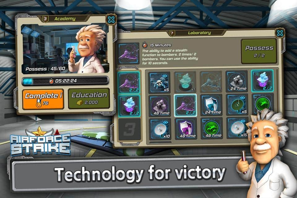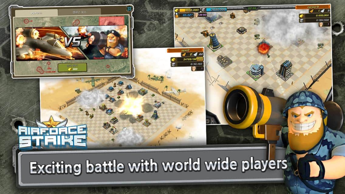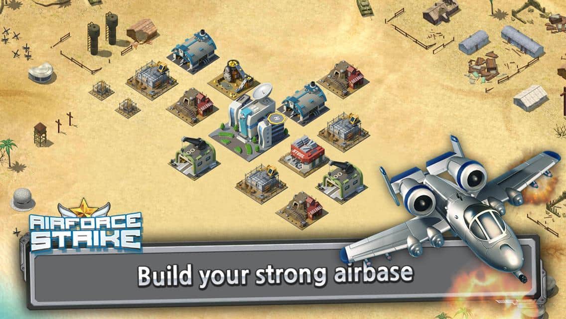 Airforce Strike – стратегія на android, де вам доведеться захищати свою військову базу від нальоту противника. Створіть свою військову базу і зробіть все можливе, щоб захистити її від ворожої авіації. Вашої головним захистом буде напад. Надсилайте бомбардувальники забезпечені потужними бомбами, на позиції ворога і знищуйте їх базу. Встановлюйте собі цілі і скидайте бомби і ракети у вказане місце, а також обстрілювали з кулеметів на борту літака. За кожну правильно знищену мету ви будете отримувати бали, які зможете витратити на покупку спорядження і відкриття нових бомбардувальників. Також покращуйте свою базу, ретельно оберігаючи кожен об'єкт.