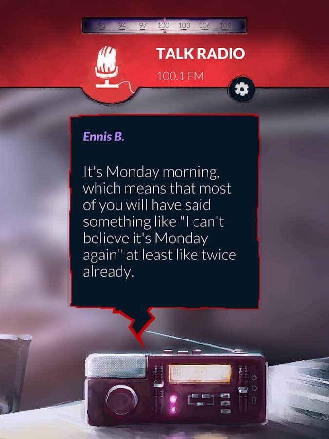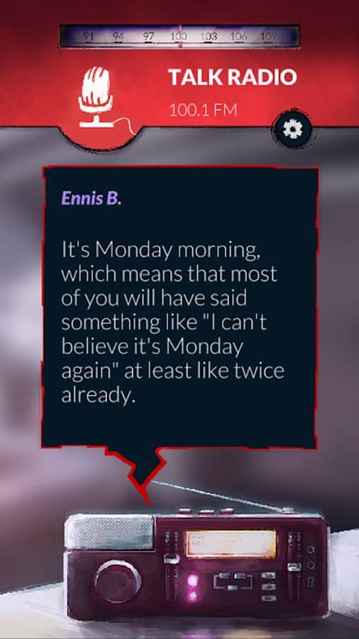 Alt-Frequencies – захоплююча та загадкова аудіо-гра на андроїд, де ви будете використовувати радіохвилі щоб відкрити світові очі на правду. Що відбувається, коли всі застрягли в одному часовому циклі, а всьому виною радіоведучі, теоретики змови, політики, підпільні активісти і собака. Вашим завданням буде викрити всіх цих людей, записуючи, перемотуючи час і транслюючи фрагменти радіопередач. Перерозподіляйте інформацію та змінюйте трансляцію протягом наступних трьох хвилин тим самим впливаючи на новинні цикли і життя людей. Спостерігайте за життям людей підслуховуючи як розвиваються їхні особисті історії в світі, який стоїть на місці.