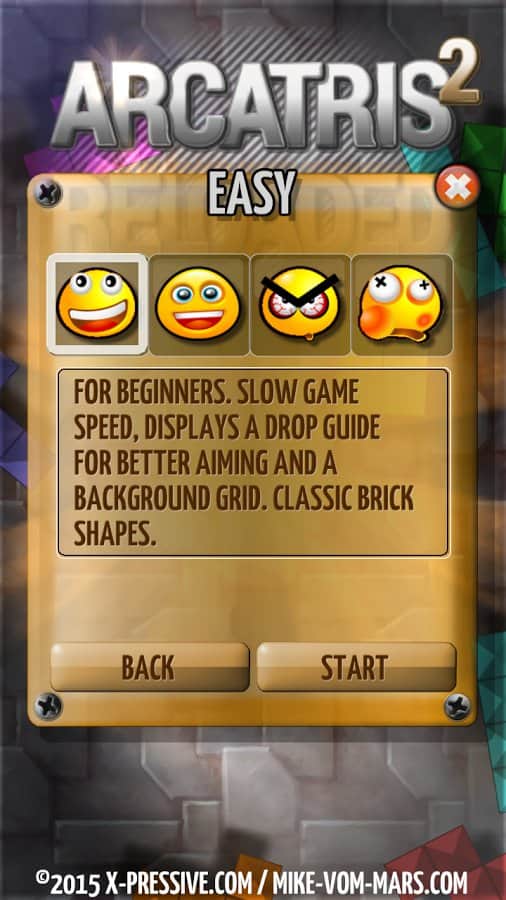 ARCATRIS 2 – тетрес на андроїд, з легким інтуїтивним управлінням. Гра в якій вам належить складати різні падаючі фігури в ряди так, щоб не залишилося порожніх клітин. Все ідеально зібрані лінії будуть зникати, а решта залишатися і будуть наближати вас до поразки. Збирайте рядки як можна швидше, обертаючи падаючі деталі і отримуйте за це нагороди і бонуси. Ця гра перевірить на ділі вашу реакцію і навички. Вибирайте придатний для вас режим складності, починаючи від новачка і закінчуючи режимом, підходящим для досвідченого гравця. Набирайте достатню кількість очком і змагайтеся зі своїми друзями за перші місця в таблиці лідерів.