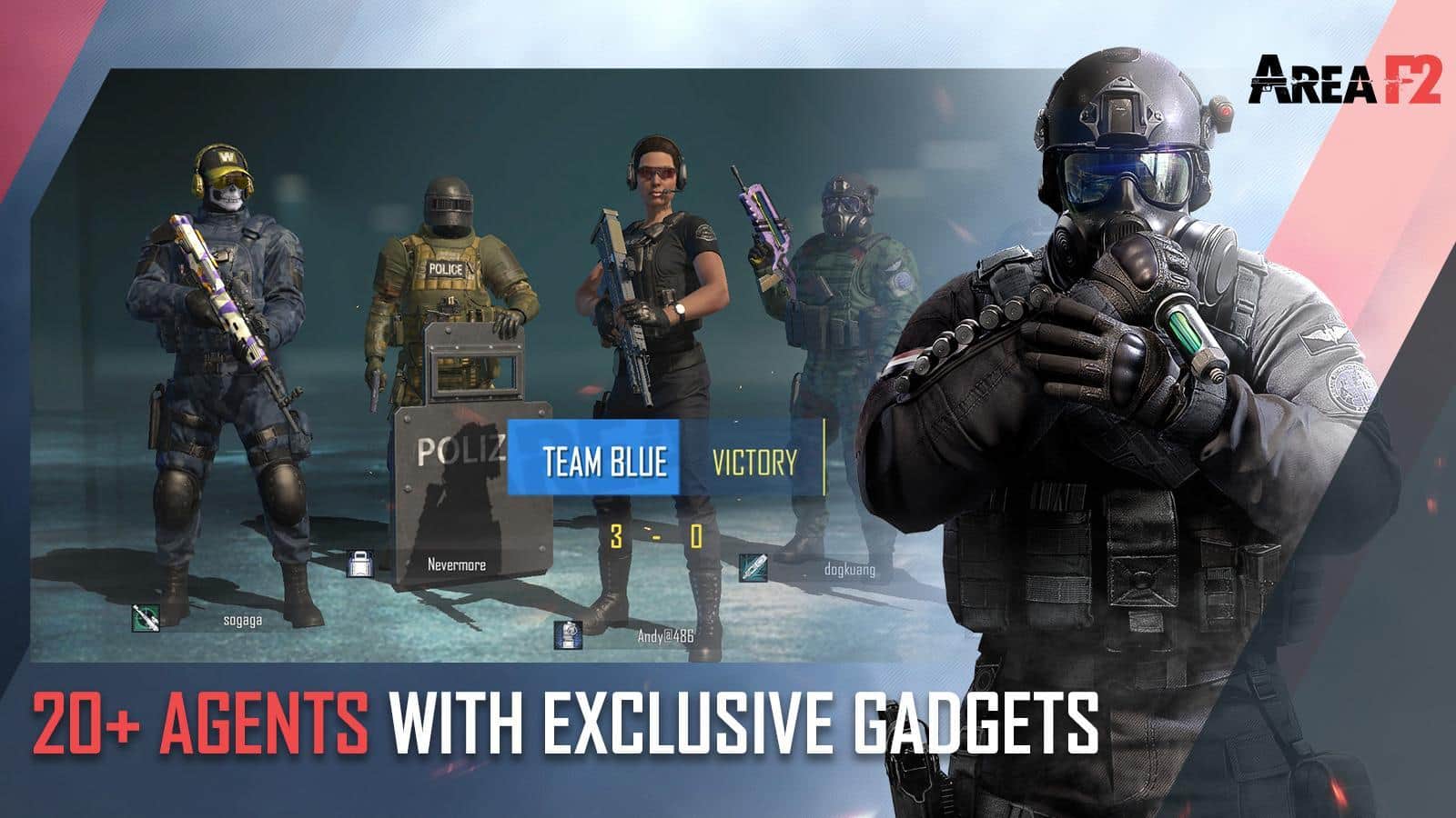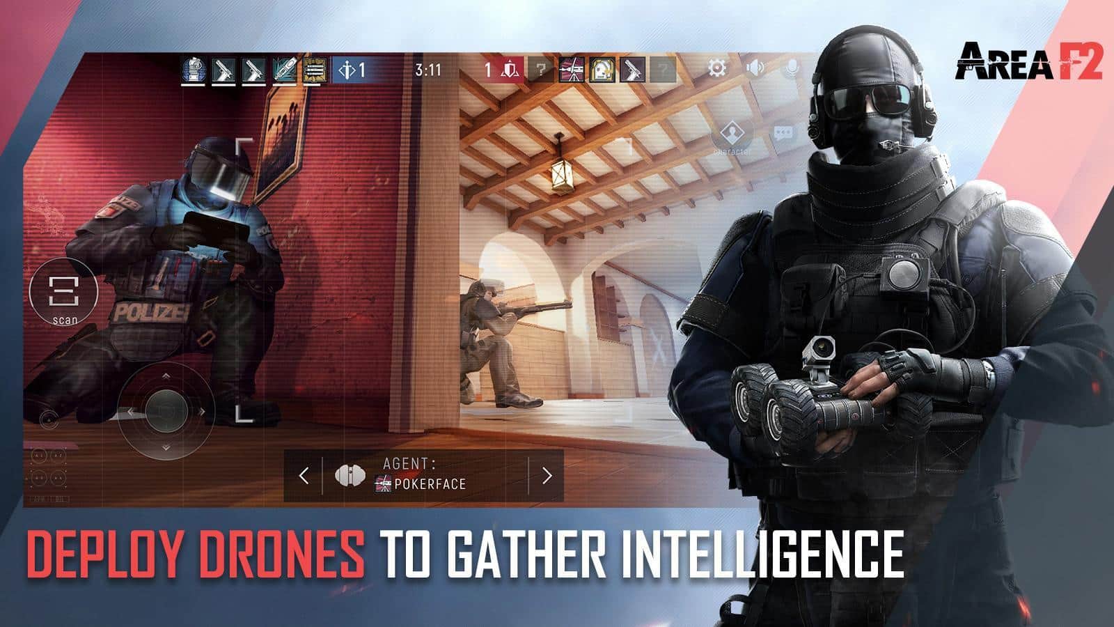 Area F2 — перший Close Quarters Battle FPS для мобільних пристроїв. Вибирайте одного з понад 20 агентів, кожен з яких володіє своїми особливими здібностями, і атакуйте або оборонятися в неймовірно реалістичній оточенні. Будь-який дах або стіну можна зміцнити або, навпаки, зруйнувати. Гра змушує бійців проявляти неабияку майстерність і тактичну кмітливість — адже ворог може прорватися через будь-яку стіну. Встановіть кулемет і ведіть вогонь на придушення, знесіть стіну розривною стрілою з арбалета або закладіть в точці передбачуваного входу міну-розтяжку. Запускайте дронов і виявляйте мети, або глушити сигнал супротивника, щоб залишитися непоміченими. Хто виграє інформаційну війну, той на півдорозі до перемоги.