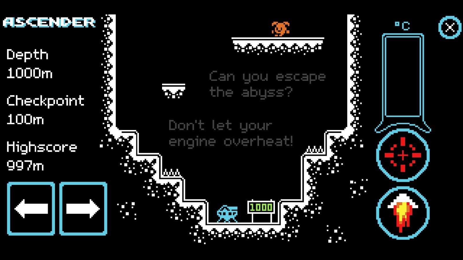 Зануртеся в ностальгічний світ піксельної графіки та чіптюна з нашою унікальною 8-бітною аркадною грою Ascender. Ваша подорож розпочинається у глибинах таємничої прірви, де вас чекає захоплююча пригода, повна випробувань та небезпек. Рухайтеся по складному ландшафту, використовуючи просте та інтуїтивно зрозуміле мобільне керування. Але будьте обережні: ваш двигун може перегрітися, якщо ви не будете уважні. Щоб досягти вершини, вам доведеться балансувати між швидкістю та контролем, стратегічно плануючи кожен крок. Гра пропонує 1000 метрів унікального дизайну рівнів, де вас чекають різноманітні перешкоди, секрети та милі вороги, яких потрібно перемогти. Кожні 100 метрів ви знайдете контрольну точку, де зможете відпочити та підготуватися до наступного етапу підйому.