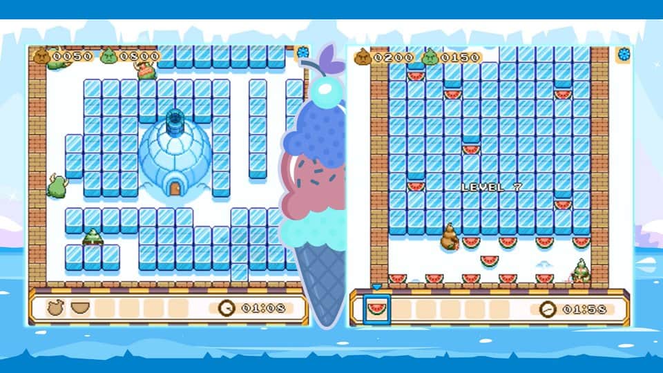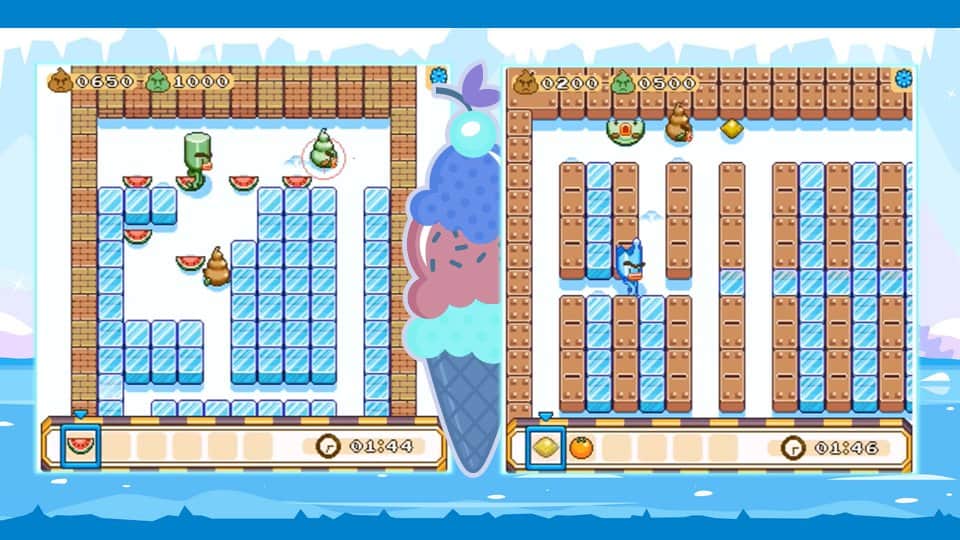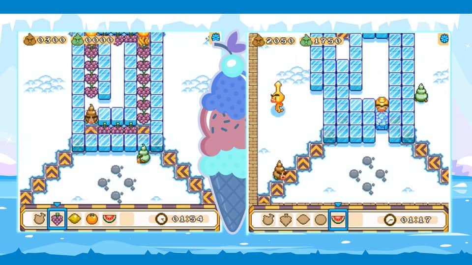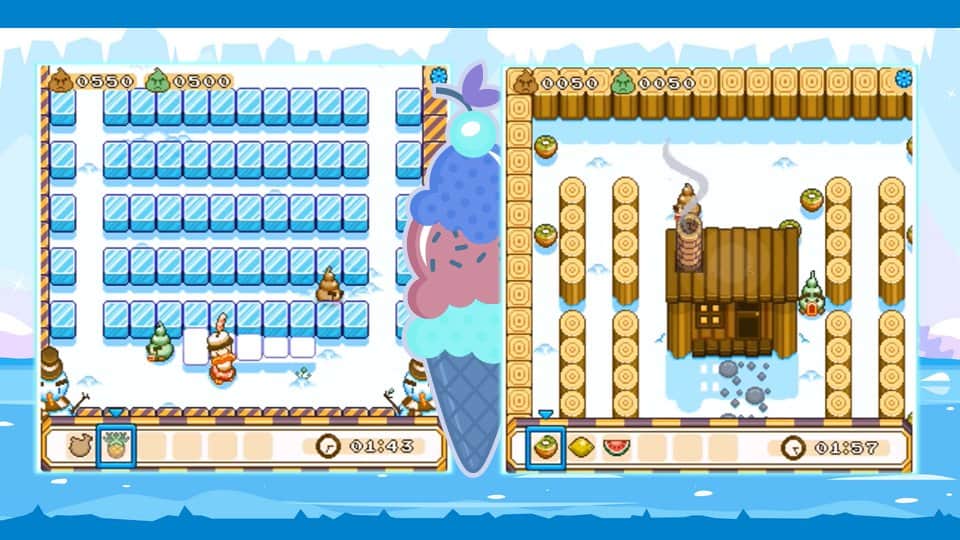 Bad Ice Cream Ice-Powers – візьміть під свій контроль смачне морозиво і пройдіть небезпечні рівні. У цій грі вашою головною задачею буде пройти весь лабіринт ігри і зібрати фрукти, розташовані на ігровому полі раніше, ніж до вас доберуться вороги. Дійте як можна швидше і не давайте ворогам шанс зловити вас. Збирайте шматочки фруктів і слідкуйте за повільної розморозкою ворогів. Рухайтеся якомога швидше і розраховуйте свої ходи намагаючись не потрапити в пастку. Проходьте рівні як можна швидше, для того щоб потрапити в таблицю лідерів. Гра порадує гравців піксельної графікою, 40 рівнів і 100 карт.