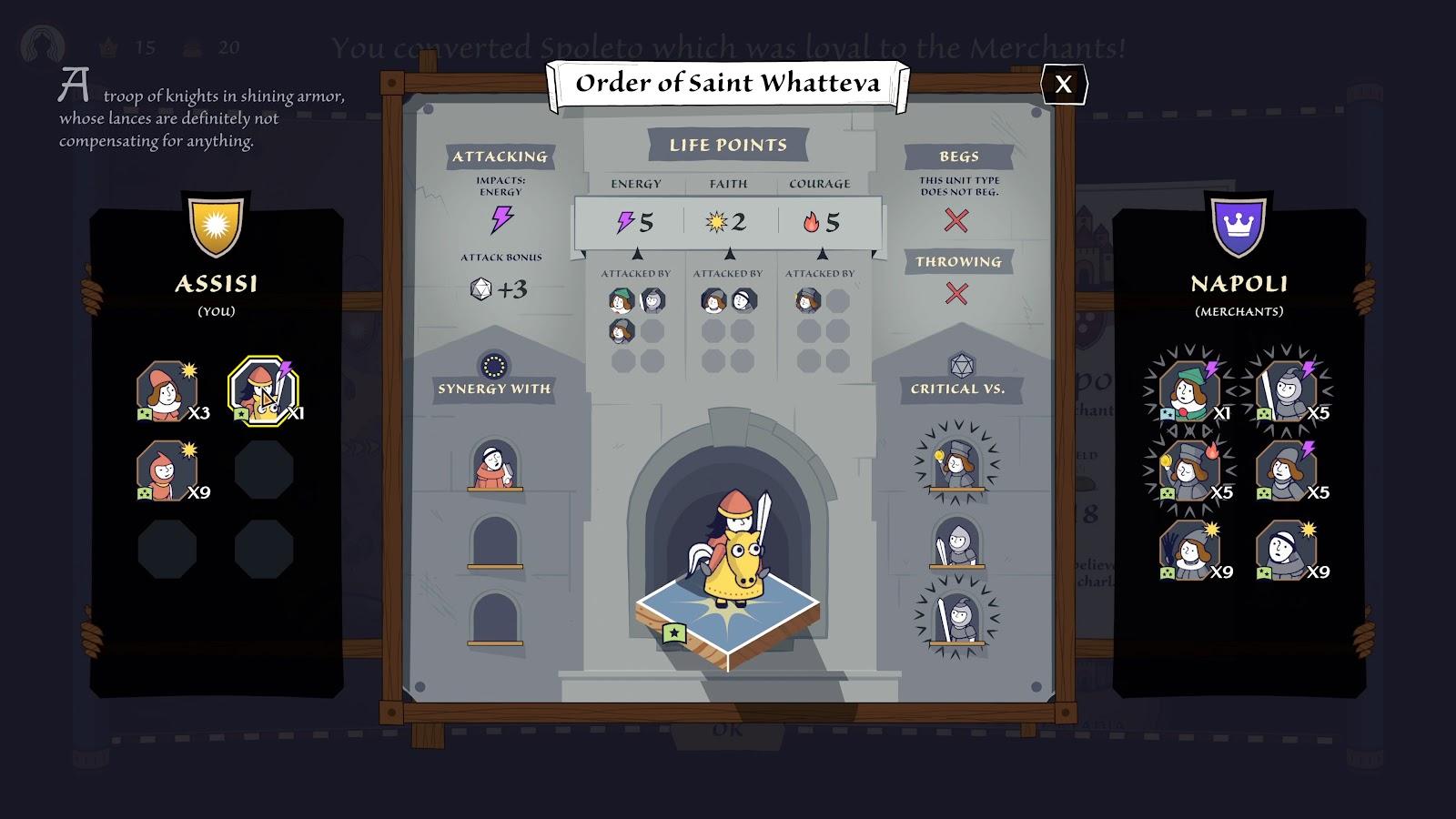Ставши святим - Пориньте в атмосферу середньовічної Італії та створіть власний релігійний рух у стратегічному roguelike. Оберіть доктрину, збирайте послідовників і вирушайте завойовувати міста, поширюючи свою віру силою переконання або зброї. Беріть участь у динамічних битвах в реальному часі, комбінуйте загони з унікальними здібностями та використовуйте рельєф на свою користь. Приймайте доленосні рішення, що впливають на розвиток вашої ідеології та шлях до святості. Кожне проходження — новий виклик, де тільки найсильніші зможуть увійти в історію.