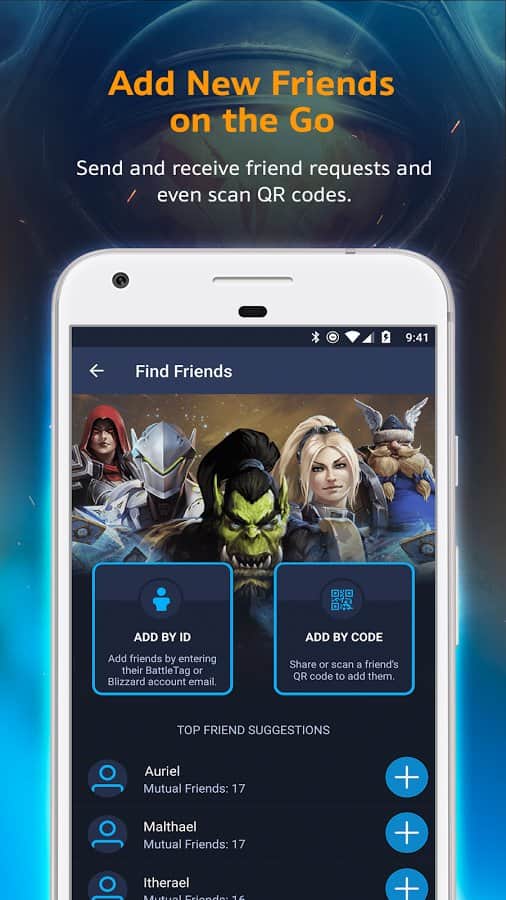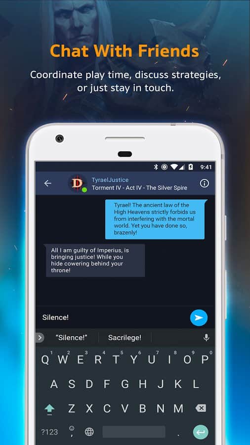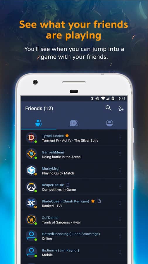 Blizzard Battle.net - просте мобільний додаток за допомогою якого ви зможете стежити за своїми друзями, і за тим, у які ігри вони грають. Грати ви не зможете, проте в будь-якому місці і в будь-який час зможете спілкуватися зі своїми друзями. або ж можете відповідати на повідомлення в той момент коли граєте. По суті додаток просте і виконує всі ті ж функції що і його аналог на ПК.