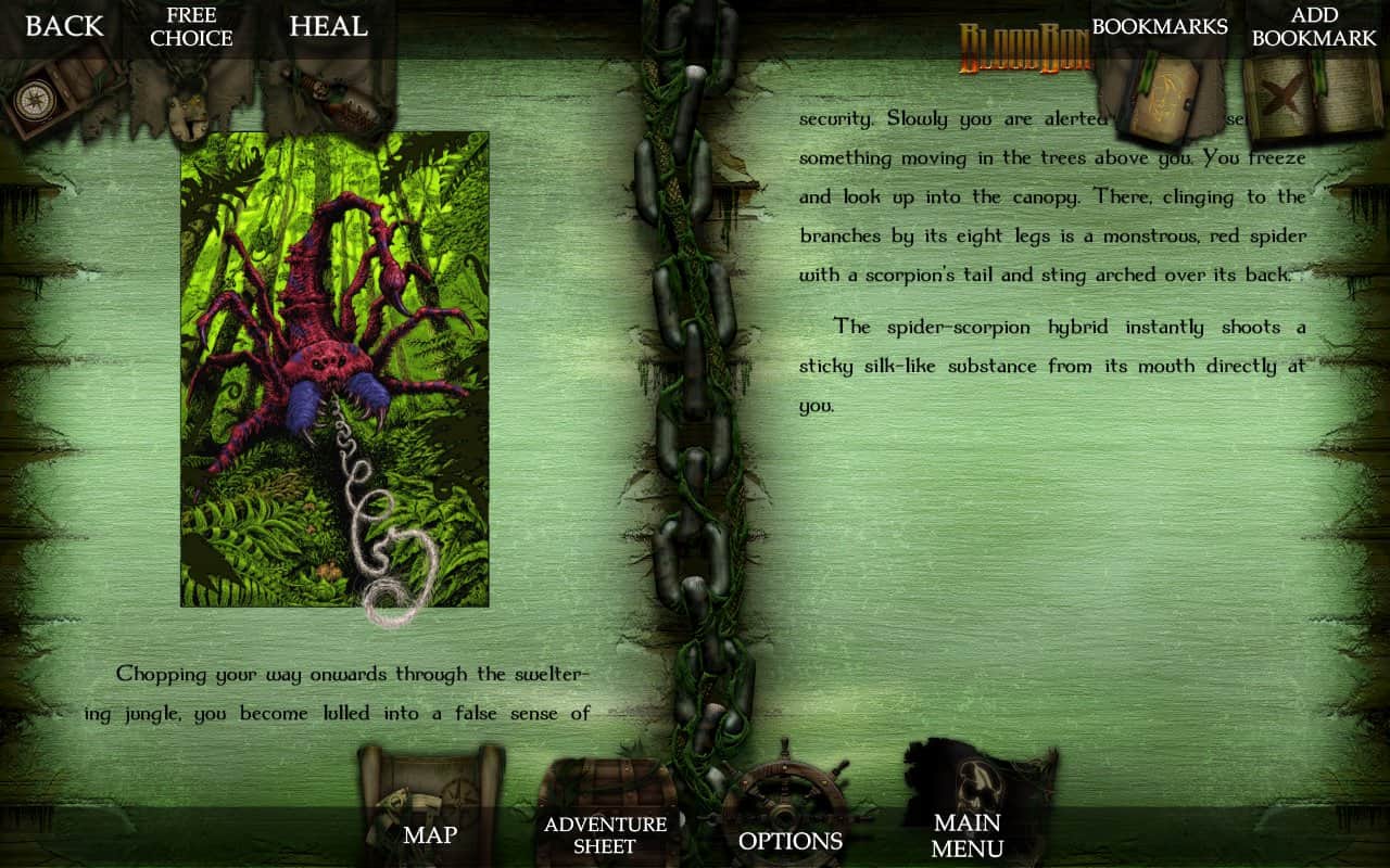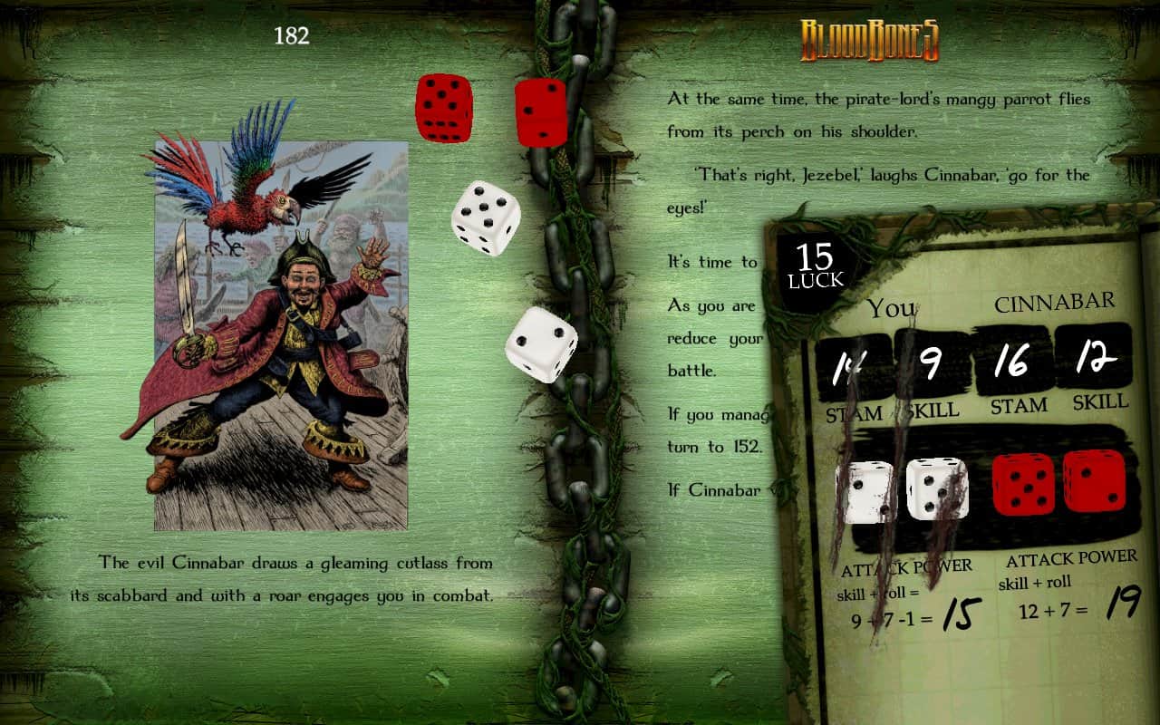 Bloodbones - Страшний пірат лорд Кіноварі, Гроза Дванадцяти морів, тероризував всіх моряків Старого Світу, поки хоробрий шукач пригод поклав кінець його злодействам. Але ось він повстав з мертвих, щоб помститися. Але тепер він володіє темними силами чаклунства. Станьте наступним героєм, який визволив моря від цього лиходія. Вас чекають гонки на час, подорожі по нових місцях, вибір між повнокольоровим зображенням або чорно-білим. Використовуйте унікальну зброю, такі як метальні ножі і газ-глобуси додаткових стратегіях. Це чудове фантазійне пригода від Стіва Джексона і Яна Лівінгстон включає в себе також спеціально написаний саундтрек та звукові ефекти.
