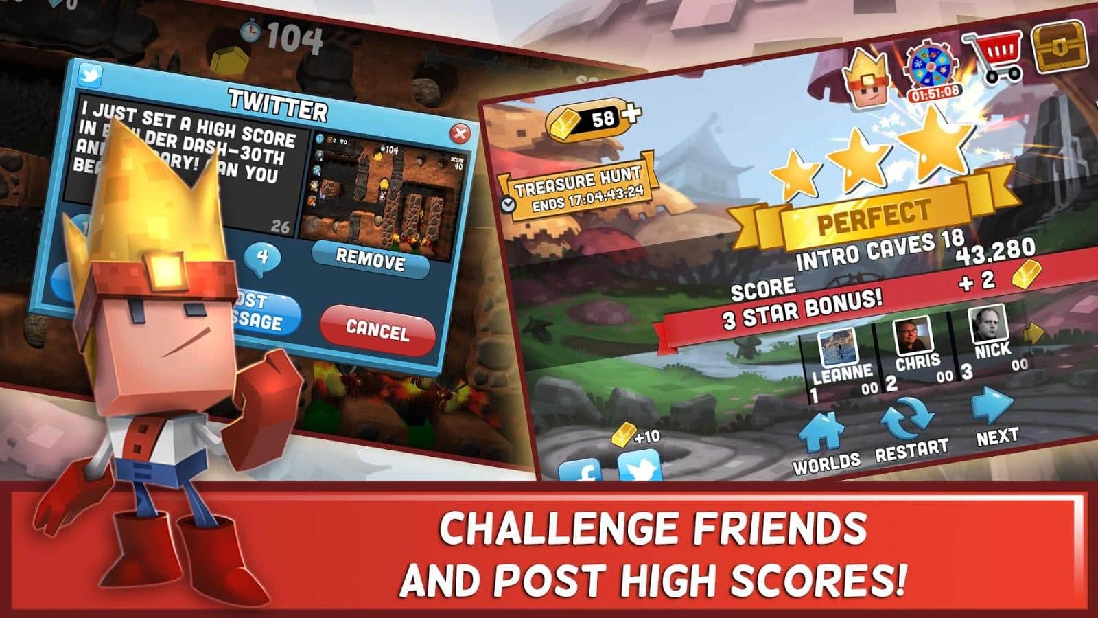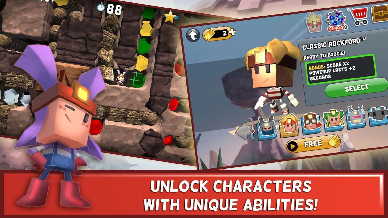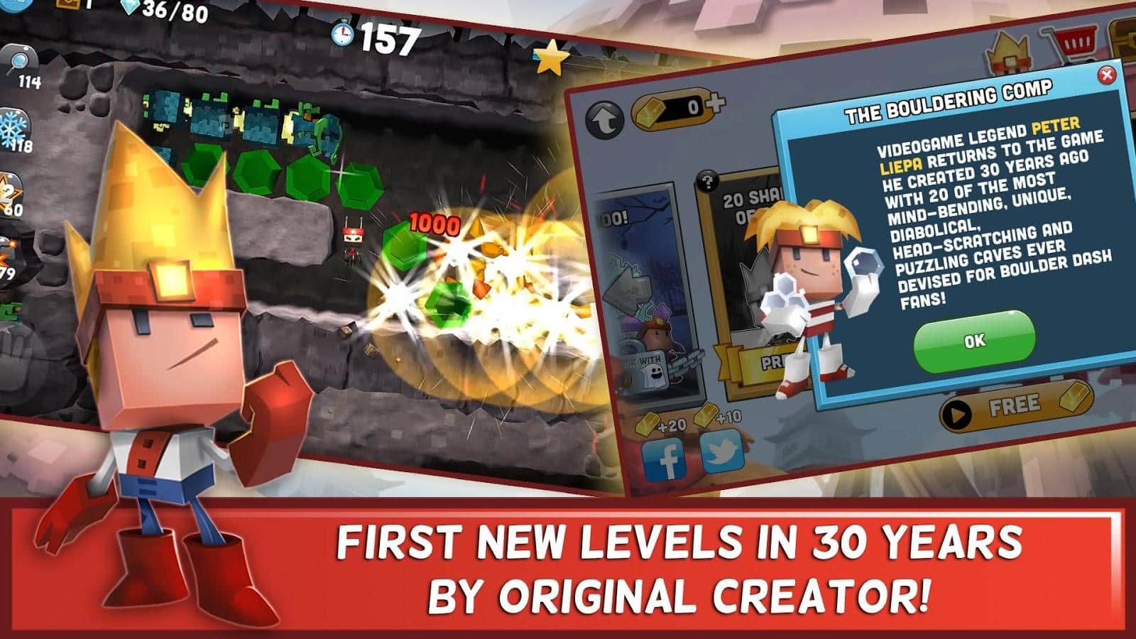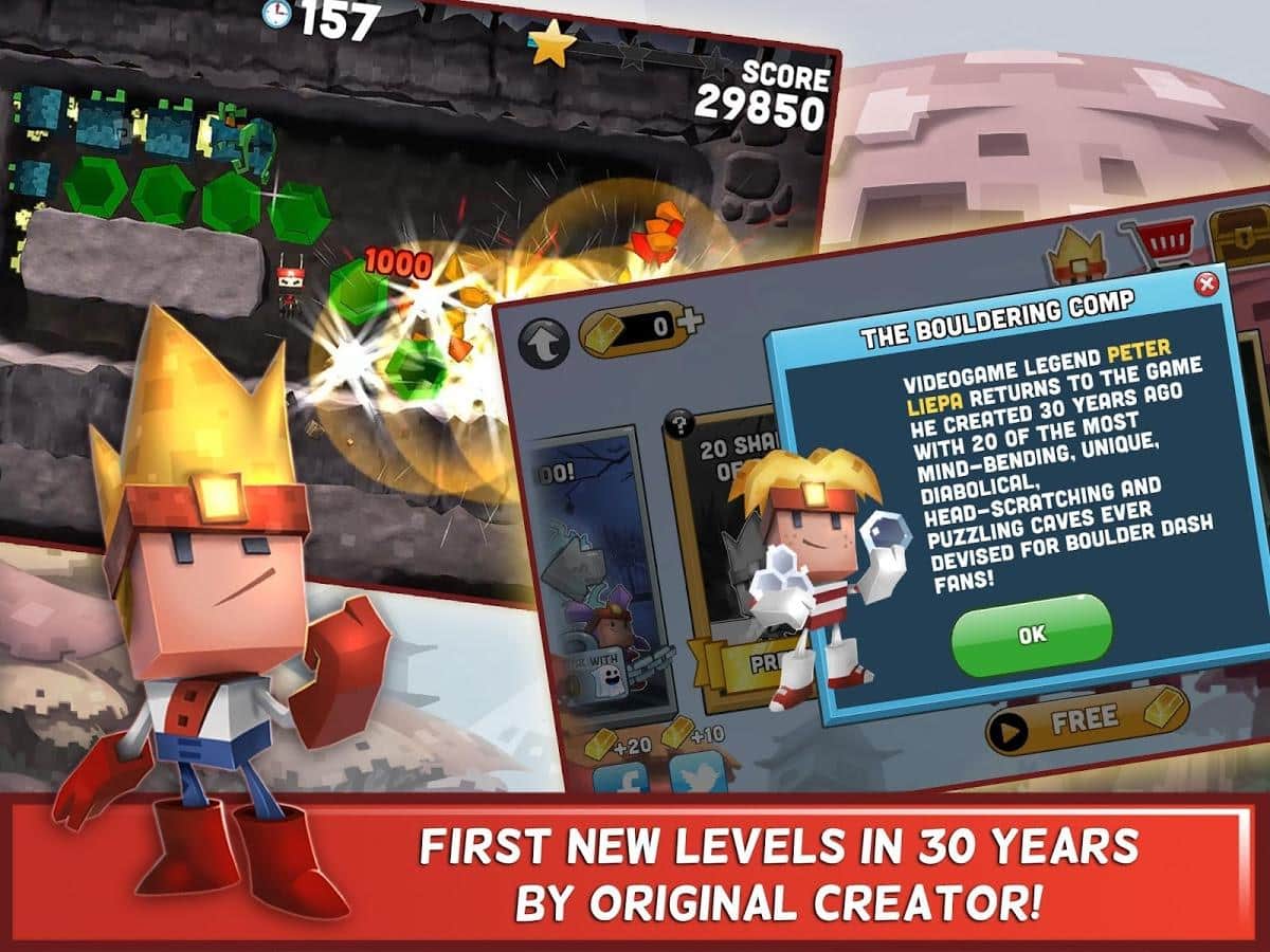 Boulder Dash-30th Anniversary - платформер з елементами головоломки, в якій вам належить вирішувати безліч різних завдань. Почніть досліджувати печеру прямо зараз, збирайте дорогоцінні камені, прорубайте собі шлях, уникаючи підступних ворогів і падіння величезних валунів. Відкрийте для себе скрині з скарбами і рідкісними колекційними бонусами, а також 10 унікальних світів і 9 різних персонажів.