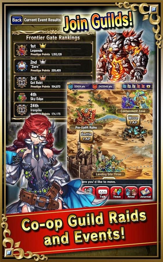 Brave Frontier - безкоштовна РПГ на андроїд від азіатських розробників. У грі зібрано дуже велика кількість персонажів: за інформацією з офіційної сторінки гри, їх близько 200 штук, що не може не вразити. Грайте разом з друзями, збирайтеся в клани, і трощіть ворогів. Також ви можете позмагатися лицем до лиця в режимі PvP. Графіка в грі виконана у вигляді японського аніме.