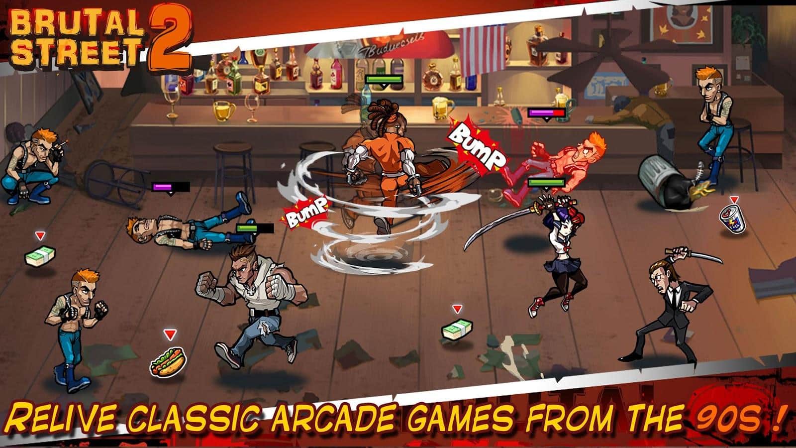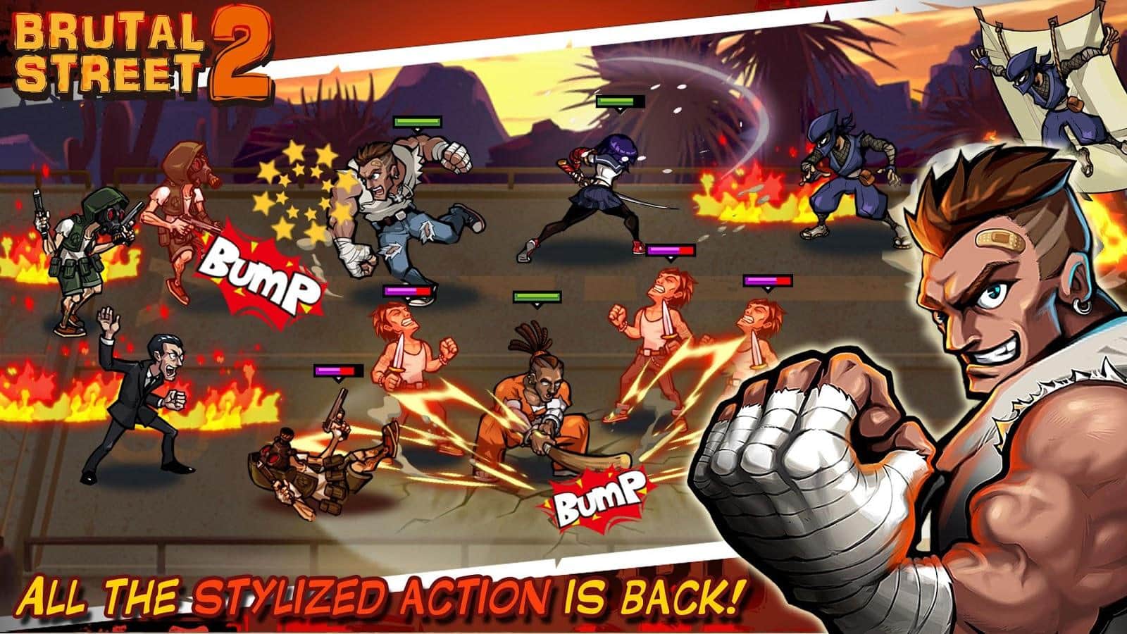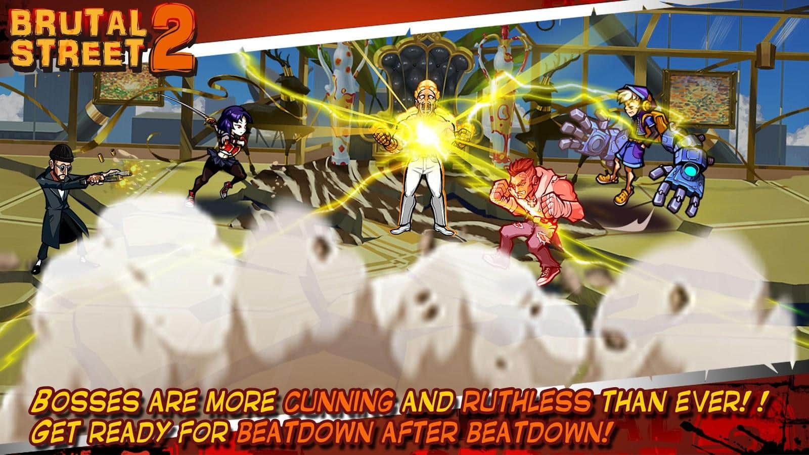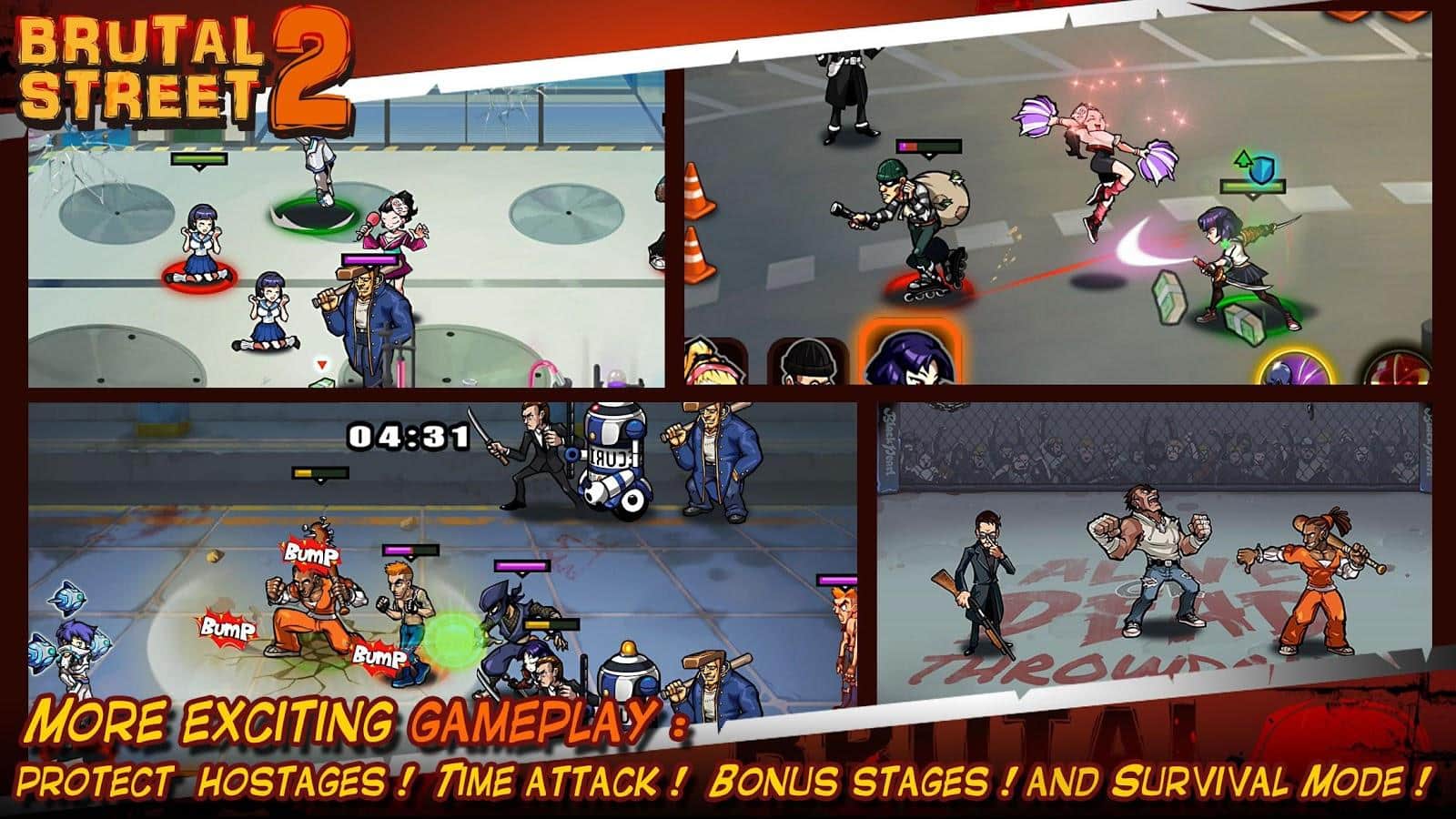 Brutal Street2 – гра на андроїд, де ви будете брати участь у війні бандитів і мафії за контроль над містом. У цій грі ви будете переміщатися по різних районах міста і вступати в бій з численними ворогами. Візьміть під свій контроль невеликий загін, що складається з героїв мають унікальні здібності і використовуйте їх в бою. Розробляйте свою непереможну тактику ведення бою і застосовуйте різну зброю і прийоми. Відкривайте для себе нових героїв і з допомогою них захоплюючи всю всмак в місті.