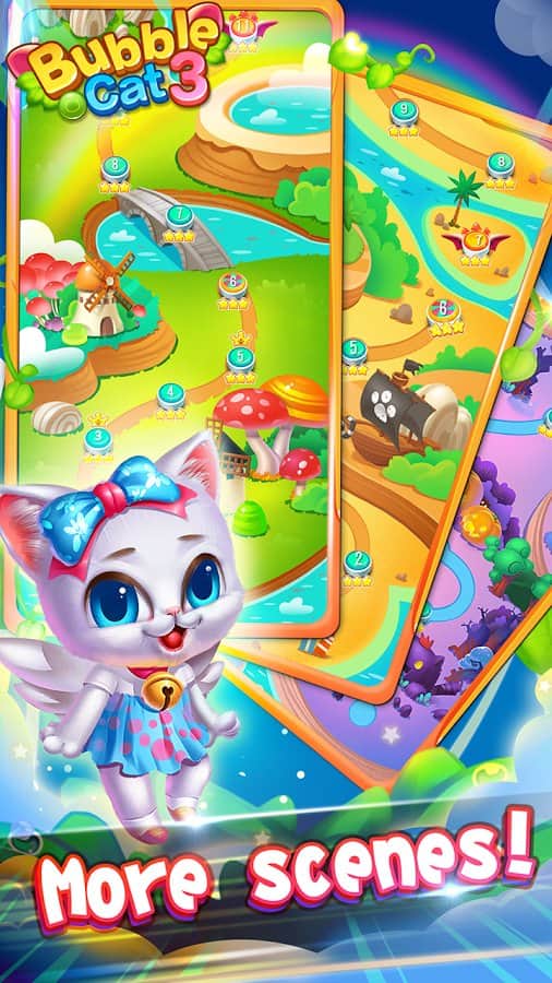 Bubble Cat 3 – гра з жанру «три в ряд», в якій вам необхідно допомогти коту звільнити своїх попередників. Вирушайте в захоплюючу подорож по світу повного повітряних бульбашок, підриваючи їх. Стріляйте кольоровими бульбашками в скупчення не менше ніж з трьох однакових за кольором бульбашок і лопніть їх, звільняючи верхню частину поля. Чим більше у вас буде влучних пострілів, тим швидше ви зберете достатню кількість очок і отримайте цінні бонуси від різних персонажів присутніх в цій грі. Лопніть як можна більше бульбашок і звільняйте кошенят знаходяться в полоні у них. У грі вас чекають 180 неповторних рівнів, милі герої кошенята і відмінні бонуси.