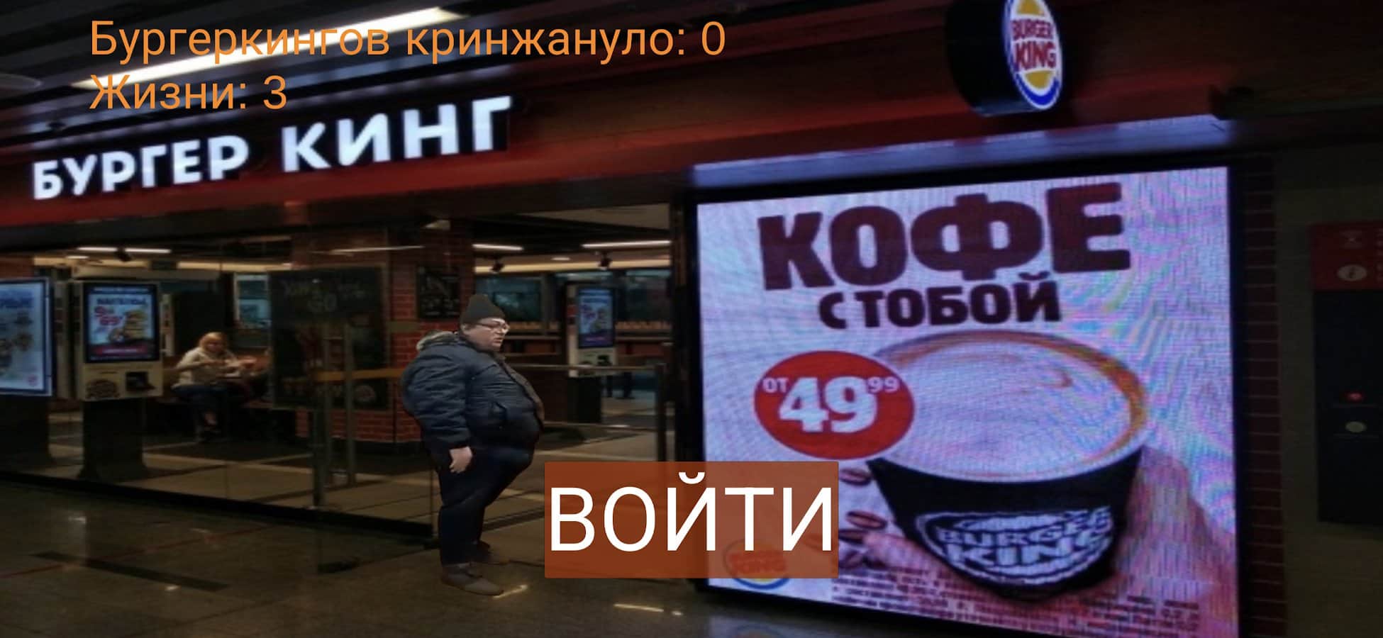 Охоронець одного з ресторанів Бургеркінг полює на вас, але не потрібно боятися бути схопленим, оскільки вам все одно доведеться від нього втікати та ховатися. Достатньо часто натискати на екран телефона, щоб підтримувати нормальний рівень шкали, оскільки якщо вона буде нижче норми, охоронець одразу вас спіймає та забере з собою. Заробляйте бали, кричіть всім відому фразу, відбивайтеся пакетами та постарайтеся не марно витрачати всі свої життя. Подивіться самі, скільки разів Бургеркінг кринжує прямо перед вами.