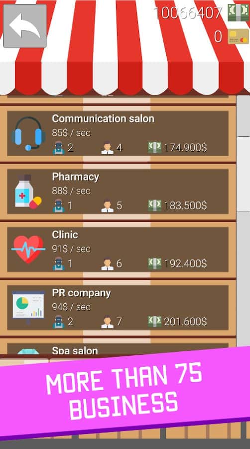 Business Clicker: Evolution – захоплюючий клікер на андроїд, де ви станете власником бізнесу. У цій грі вашою головною задачею буде стати бізнесменом і заробити свій перший мільйон. Здійсни свою мрію стати мільйонером в цій грі і доведіть всім, що ви кращий бізнесмен. Відкривайте свій бізнес, просто торкаючись як можна частіше на екрані свого телефону або планшета і змушуйте гроші працювати на вас. У грі ви знайдете безліч підказок і вбудованих систем навчання, які підкажуть вам, що потрібно робити щоб відкрити бізнес. Для того щоб відкрити бізнес вам потрібен стартовий капітал і працівники. Приготуйтеся до того, що все це буде приносити вам пасивний дохід.