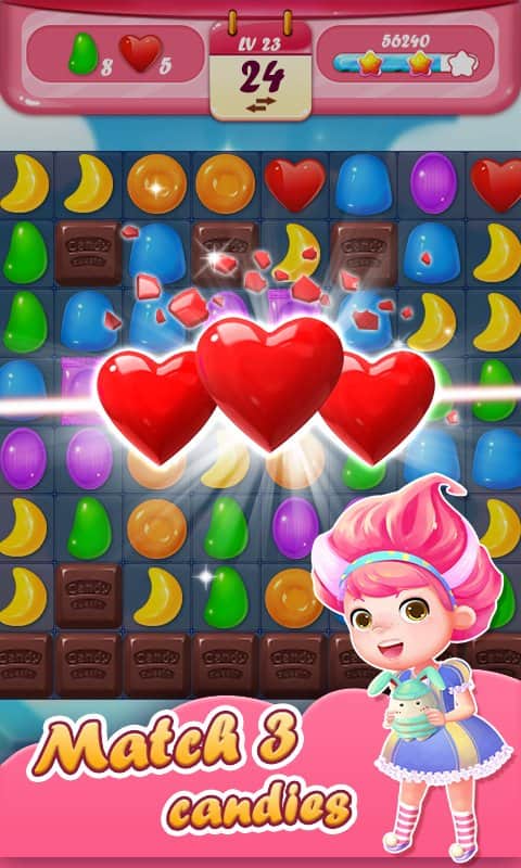 Candy Sweeten – захоплююча гра з жанру три в ряд де ви потрапите в казкову країну солодощів. У цій грі вам необхідно буде складати по три і більше однакових цукерки в ряд і підривати їх. Насолоджуйтесь барвистими вибухами і спецефектами і застосовуйте численні бонуси і посилення для того щоб набрати максимальну кількість очок і змагатися з друзями за кращі результати. Вас чекають тисячі веселих рівнів, безліч різноманітних цукерок і ураган вибухів. Отримуйте за три зірки на кожному рівні і заробляйте додаткові життя які знадобляться вам для того щоб отримати нагороди і бонуси.