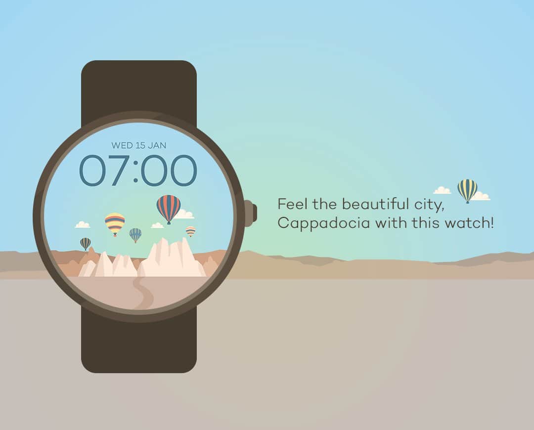 Живописный пейзаж на данном циферблате, как понятно из названия, принадлежит Каппадокии и если вам подобное по вкусу — можете украсить им свое запястье. Тем более, что картинка на экране не статична: здесь двигаются облака и воздушные шары, а также меняется фон. Что касается более приземленных и практичных функций, можно устанавливать формат даты, а кроме текущего времени на экране будет отображаться дата и день недели. Имеется энергосберегающий режим, в котором будет отображаться только время в любом удобном для вас формате.