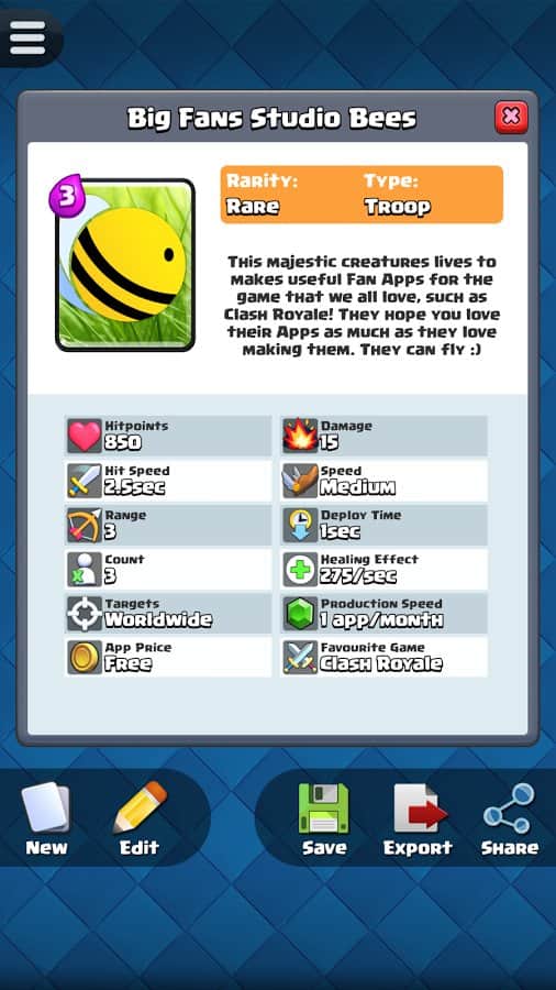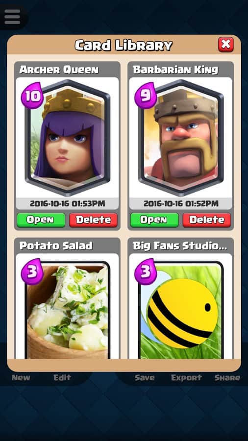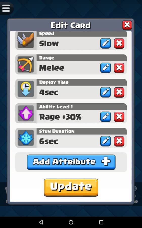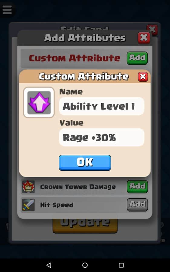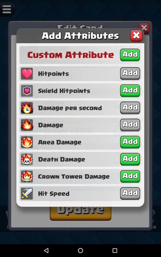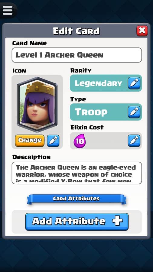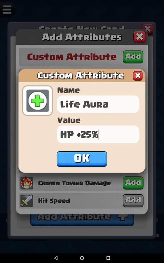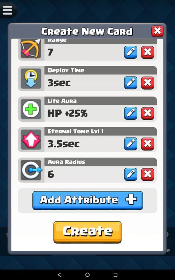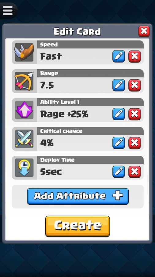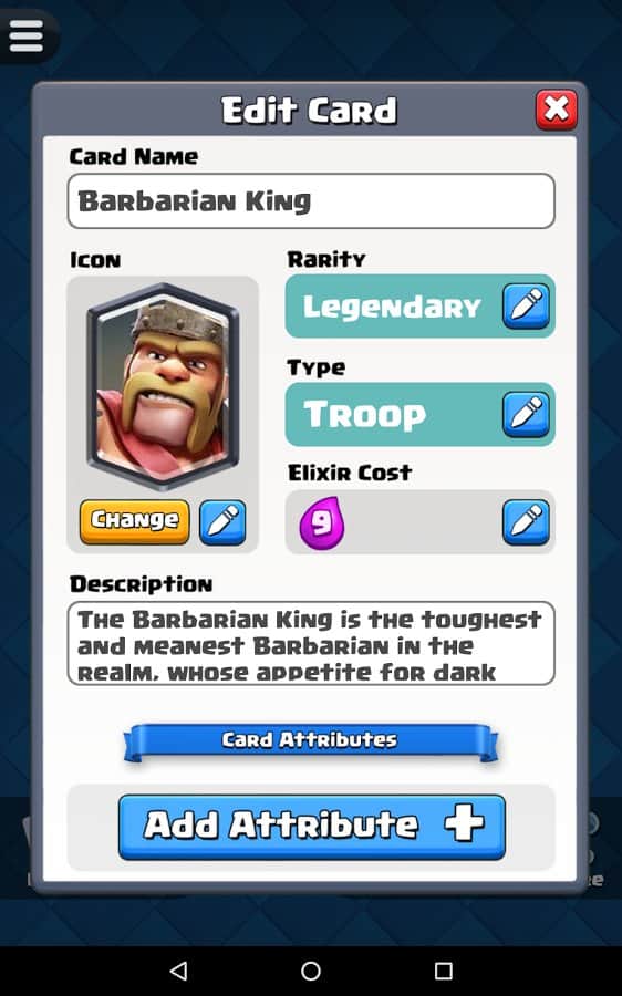 Будь-яка ідея геймера може бути реалізована їм у Card Creator for CR, адже розробники гри запропонували широкий асортимент унікальних інструментів. Тепер будь-яка божевільна і весела фантазія буде реалізована в короткі терміни з максимальною зручністю для гравця. Створюй потужний і неймовірно цікаві картки з оригінальними атрибутами, властивими тільки легендарним картками. Копі результати своєї праці в бібліотеці і з часом заглядай туди, щоб оцінити якість створених раніше продуктів. Опереди своїх друзів, грай зараз!