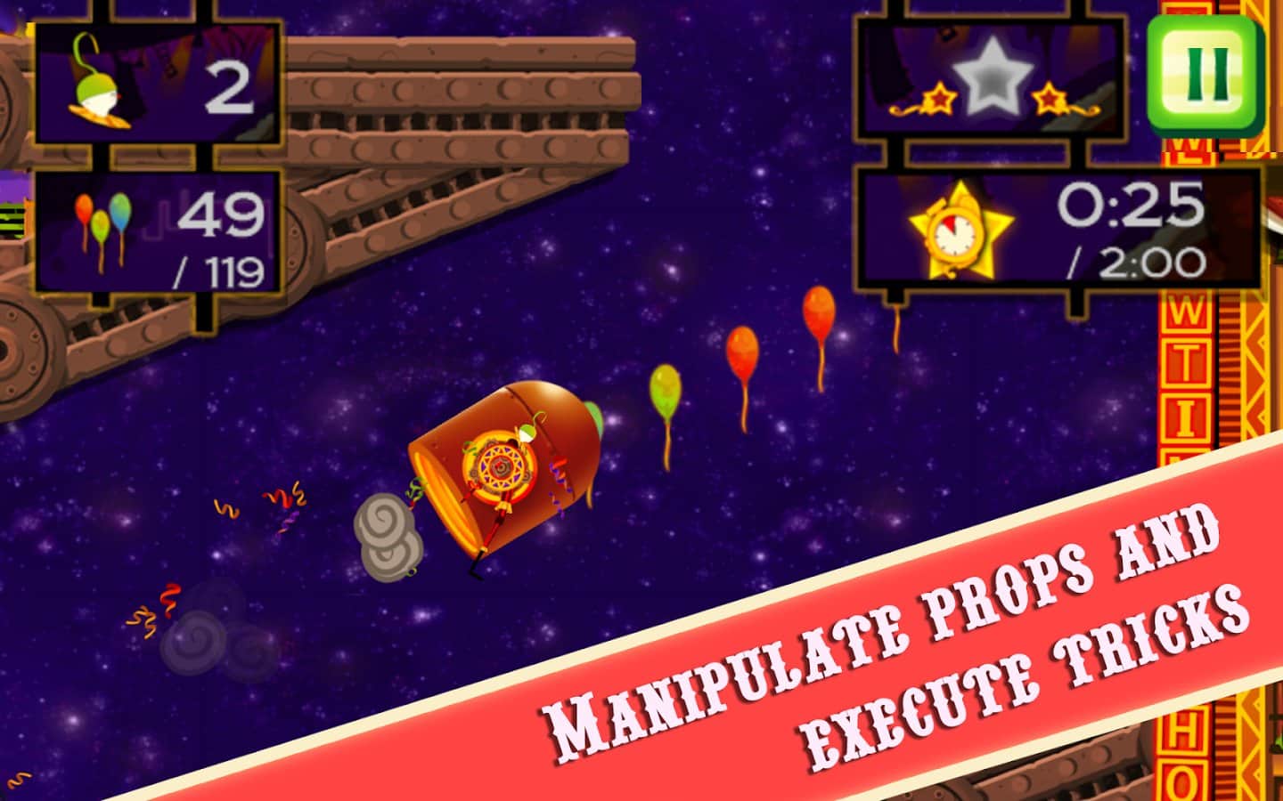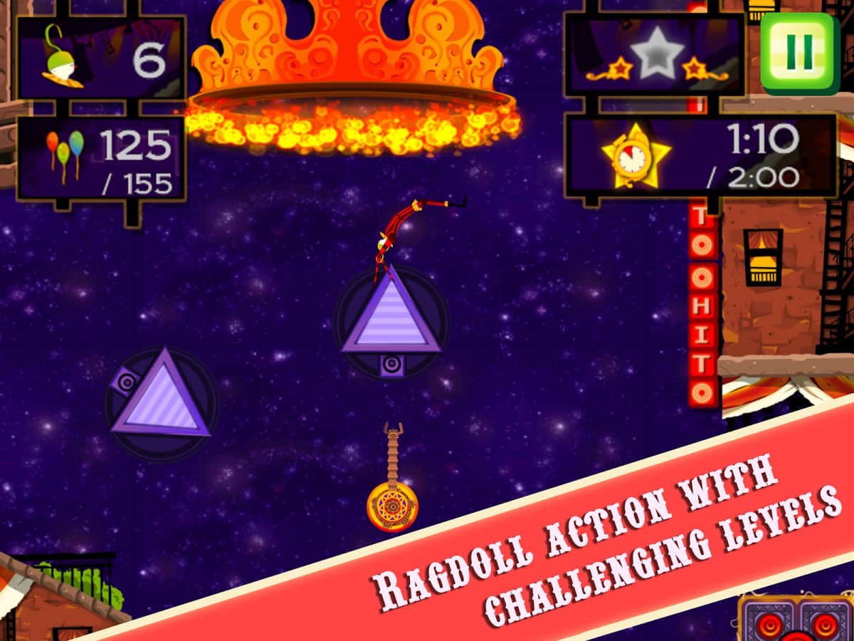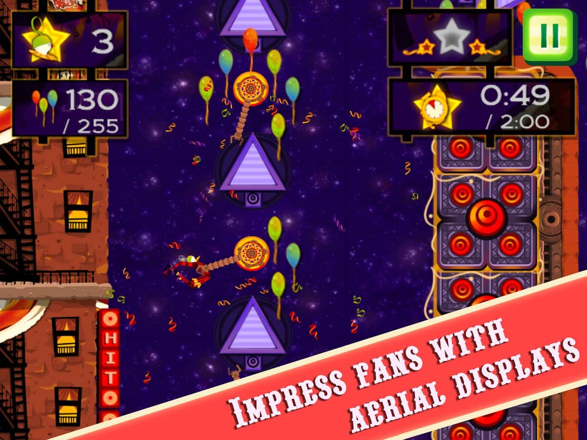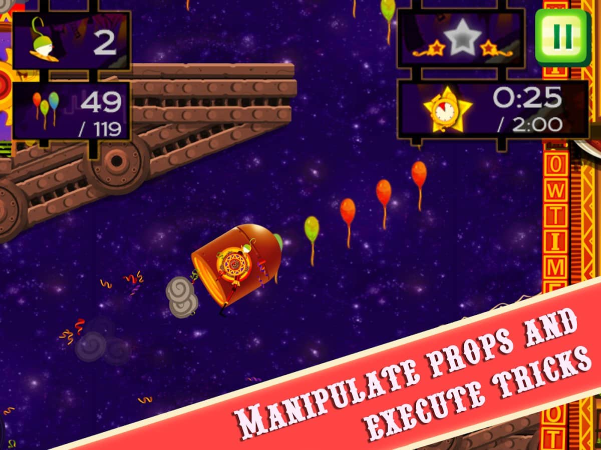 CarneyVale: Showtime – візьміть під свій контроль відважного акробата, який кидає виклик смерті і виконує небезпечні трюки. Ця гра заснована на фізиці, де вам належить переміщати акробата з однієї платформи на іншу, роблячи все можливе, щоб зібрати всі повітряні кулі і завершити рівень за мінімальний проміжок часу. Стрибайте, робіть сальто і проходите через вогняні кільця при цьому, намагаючись знайти заховані зірки на рівні. Проходите небезпечні рівні і намагайтеся завершити складні місії, не втративши при цьому всіх життів. Насолоджуйтеся неймовірними епічними діями, які будуть відбуватися у вашому телефоні і стати самим досвідченим акробатом.
