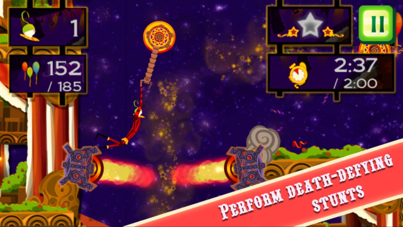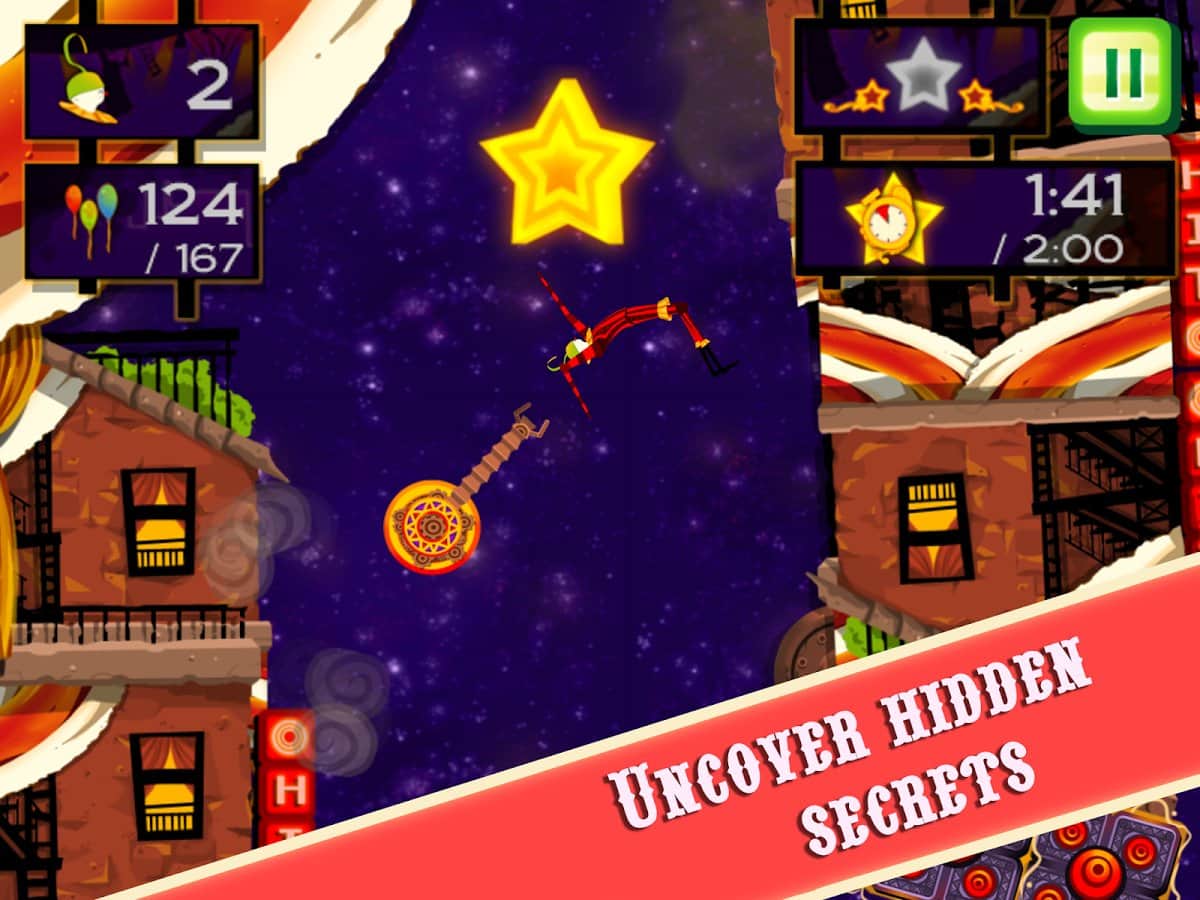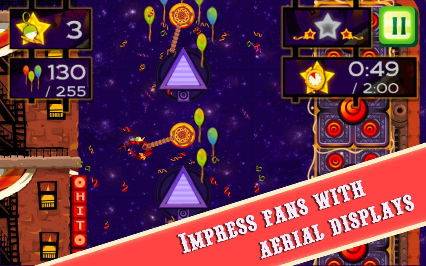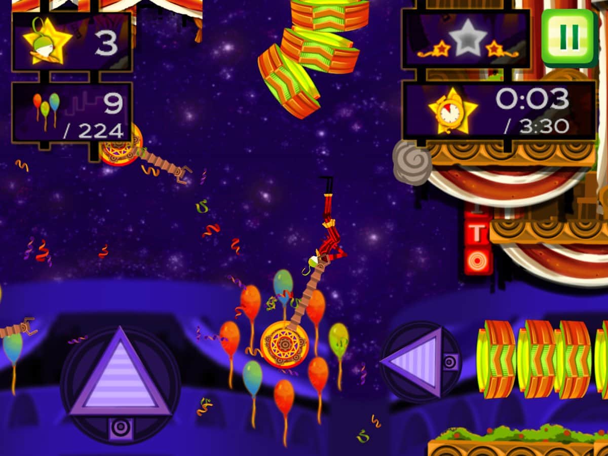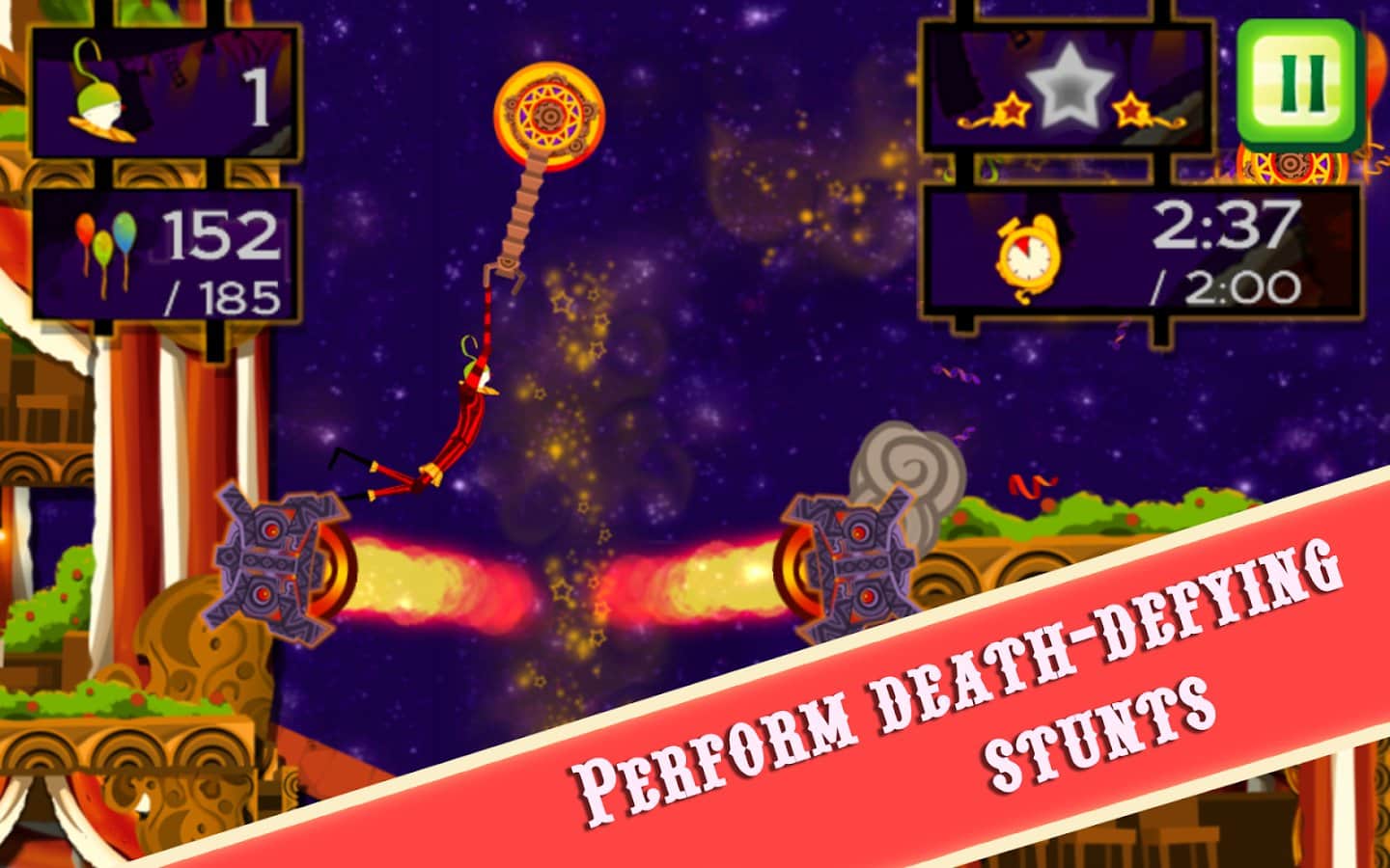 CarneyVale: Showtime – візьміть під свій контроль відважного акробата, який кидає виклик смерті і виконує небезпечні трюки. Ця гра заснована на фізиці, де вам належить переміщати акробата з однієї платформи на іншу, роблячи все можливе, щоб зібрати всі повітряні кулі і завершити рівень за мінімальний проміжок часу. Стрибайте, робіть сальто і проходите через вогняні кільця при цьому, намагаючись знайти заховані зірки на рівні. Проходите небезпечні рівні і намагайтеся завершити складні місії, не втративши при цьому всіх життів. Насолоджуйтеся неймовірними епічними діями, які будуть відбуватися у вашому телефоні і стати самим досвідченим акробатом.