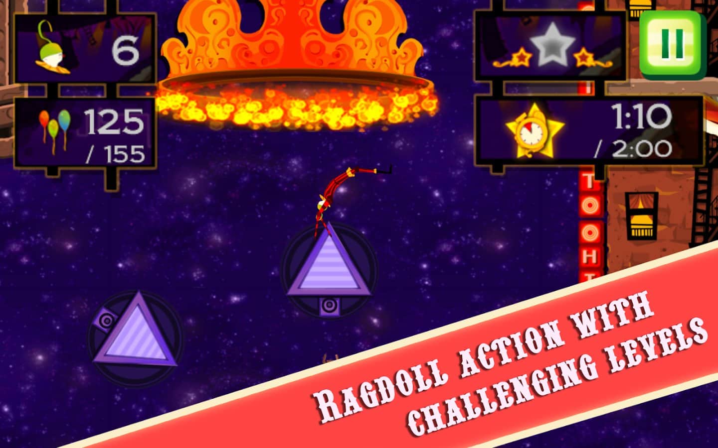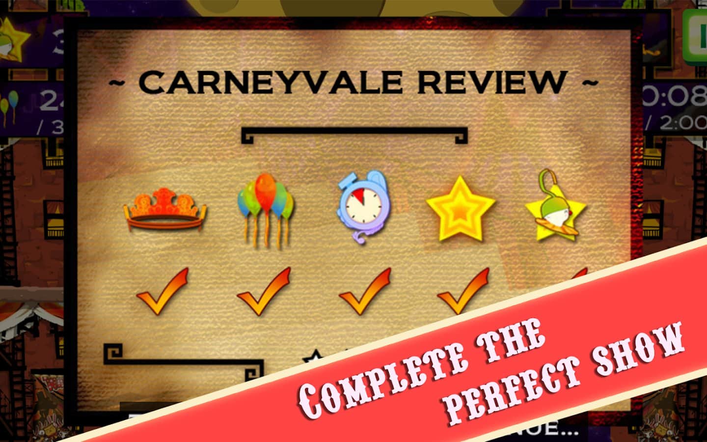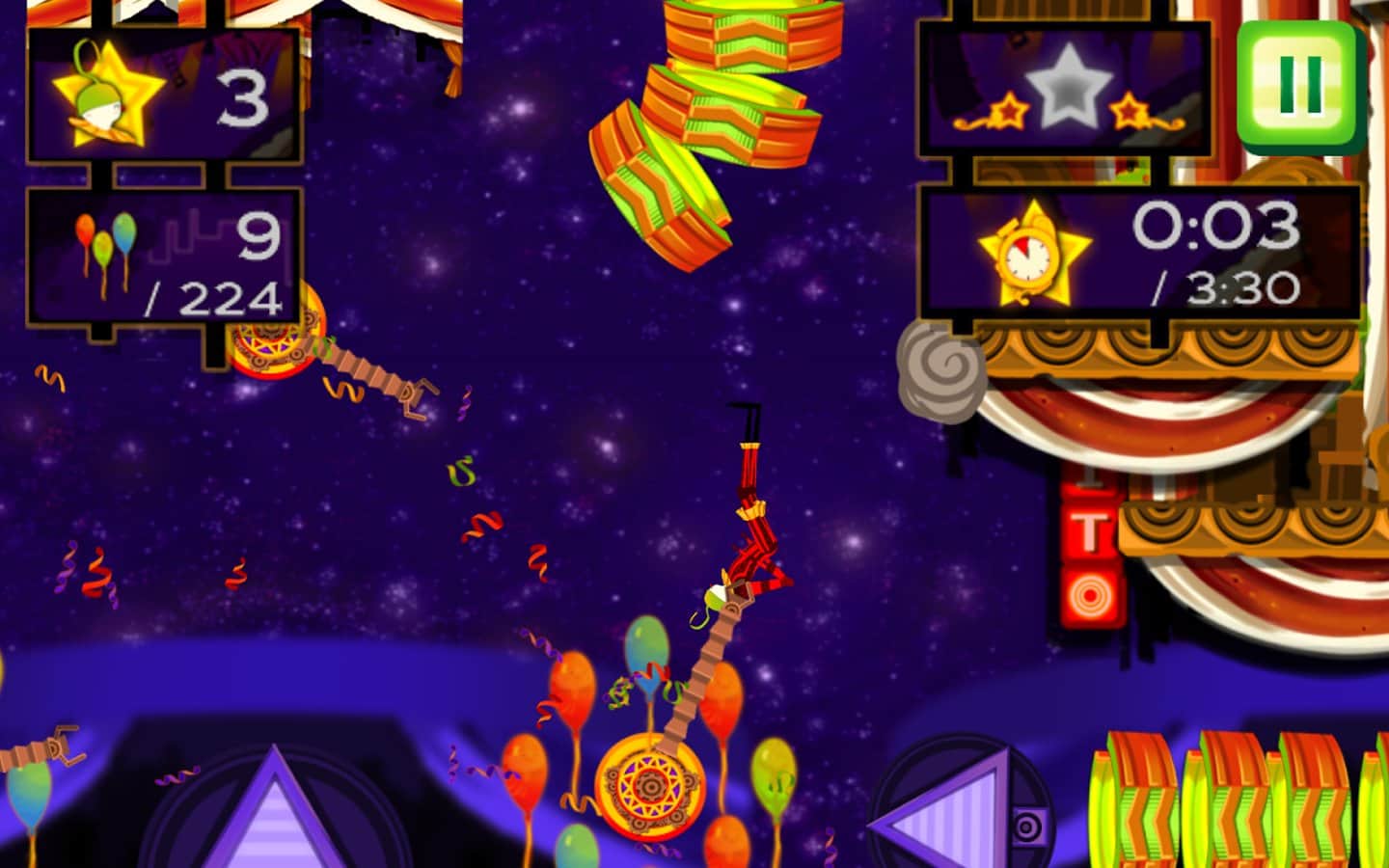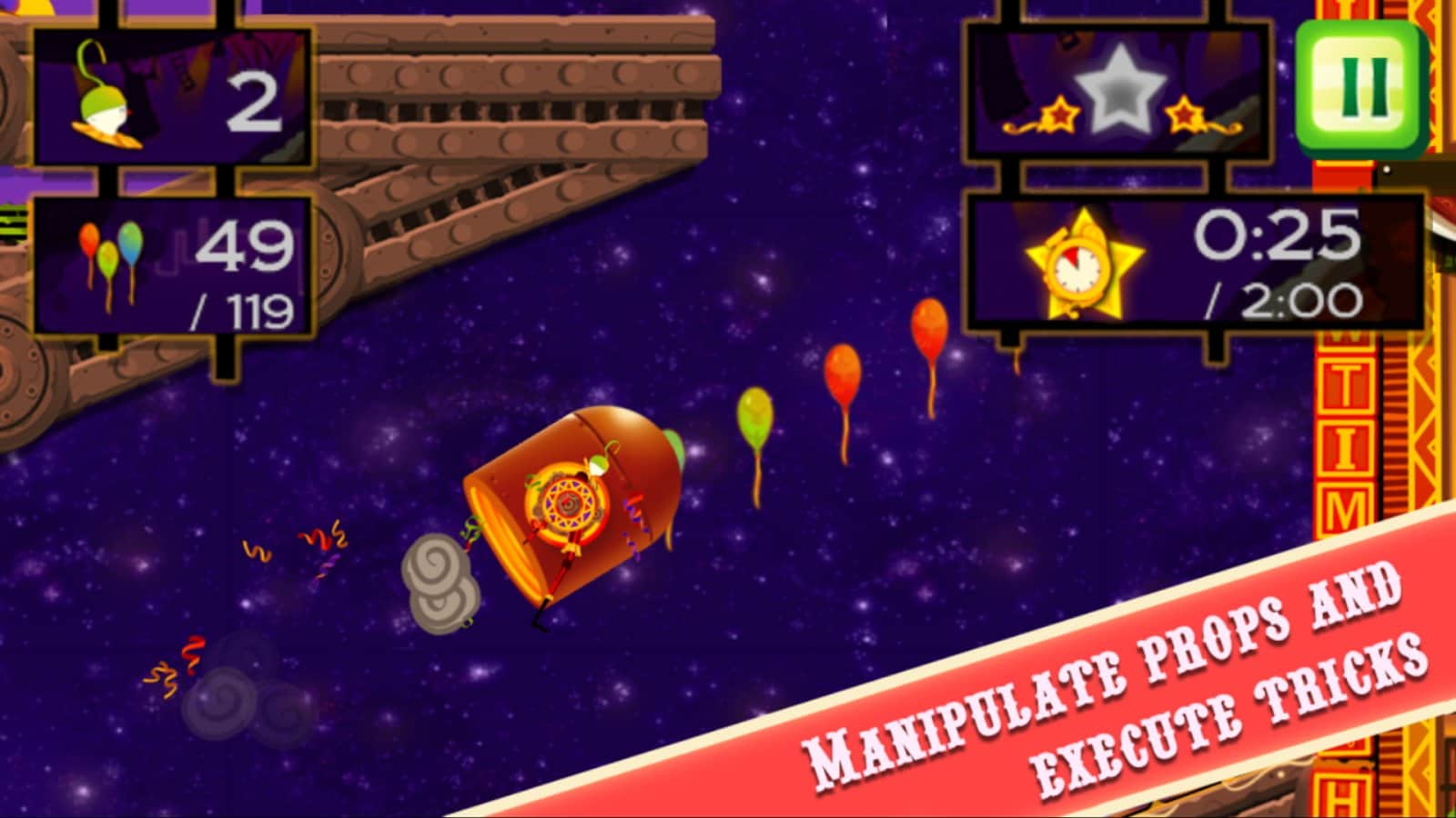 CarneyVale: Showtime – візьміть під свій контроль відважного акробата, який кидає виклик смерті і виконує небезпечні трюки. Ця гра заснована на фізиці, де вам належить переміщати акробата з однієї платформи на іншу, роблячи все можливе, щоб зібрати всі повітряні кулі і завершити рівень за мінімальний проміжок часу. Стрибайте, робіть сальто і проходите через вогняні кільця при цьому, намагаючись знайти заховані зірки на рівні. Проходите небезпечні рівні і намагайтеся завершити складні місії, не втративши при цьому всіх життів. Насолоджуйтеся неймовірними епічними діями, які будуть відбуватися у вашому телефоні і стати самим досвідченим акробатом.