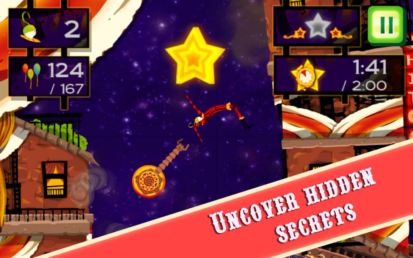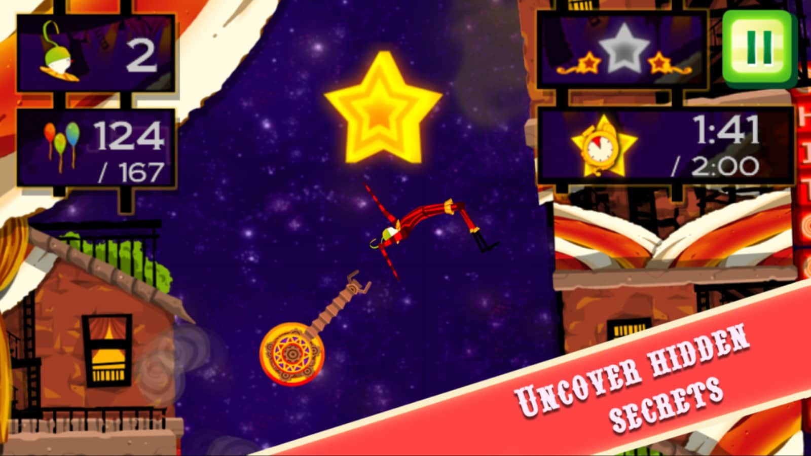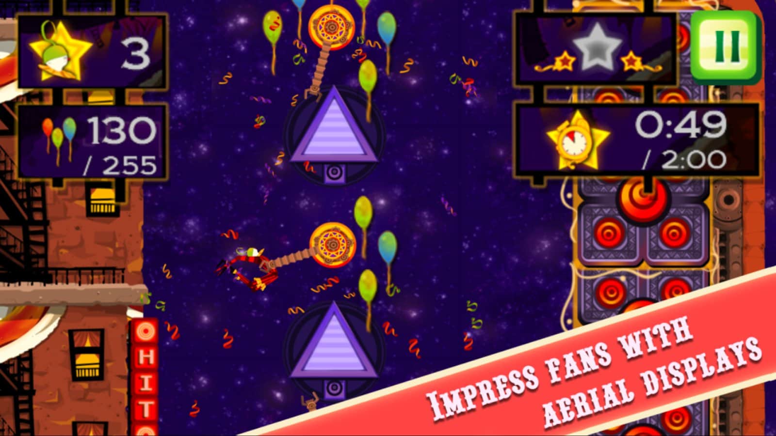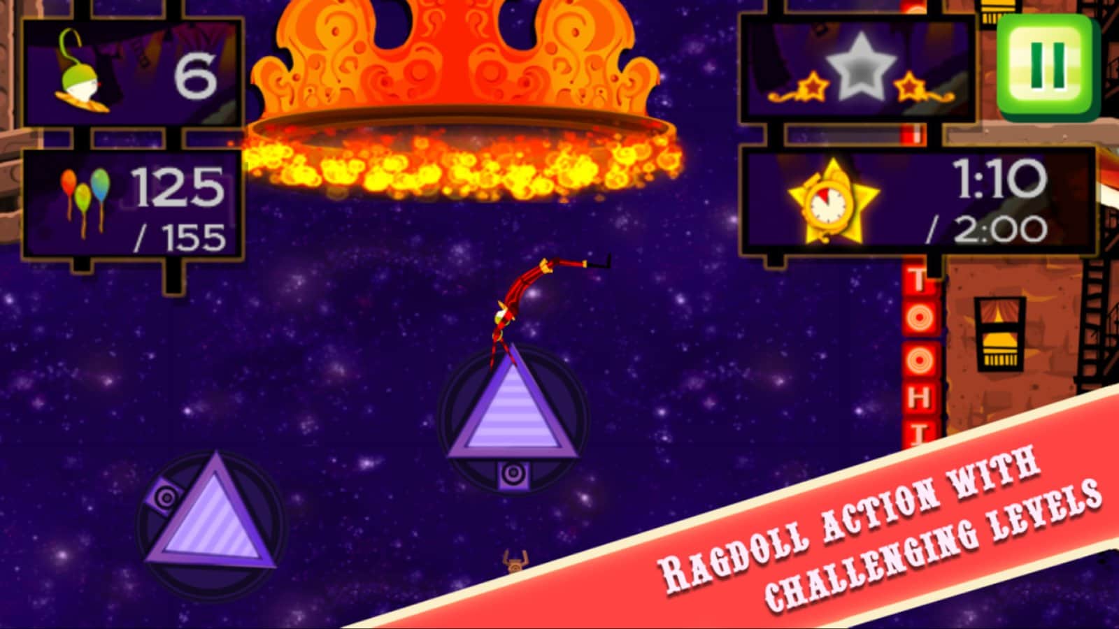 CarneyVale: Showtime – візьміть під свій контроль відважного акробата, який кидає виклик смерті і виконує небезпечні трюки. Ця гра заснована на фізиці, де вам належить переміщати акробата з однієї платформи на іншу, роблячи все можливе, щоб зібрати всі повітряні кулі і завершити рівень за мінімальний проміжок часу. Стрибайте, робіть сальто і проходите через вогняні кільця при цьому, намагаючись знайти заховані зірки на рівні. Проходите небезпечні рівні і намагайтеся завершити складні місії, не втративши при цьому всіх життів. Насолоджуйтеся неймовірними епічними діями, які будуть відбуватися у вашому телефоні і стати самим досвідченим акробатом.