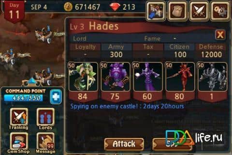 Знищуйте орди зла і встановіть законного правителя замку. Використовуючи майстерність шпигунства перебазуйте війська і змінюйте хід битв! Щоб роздобути абсолютну зброю-Меч Зевса! оволодійте серцем дочки самого Зевса. Так само в грі є можливість поліпшення відносин з жителями і керівниками замків при успішному пошуку продавців зброї, броні, кілець і зілля для замку!