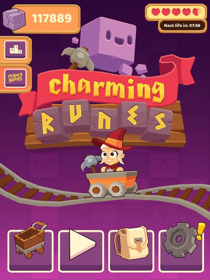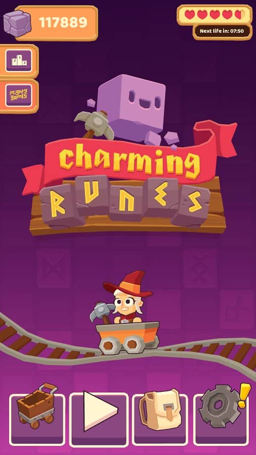 Charming Runes – гра на андроїд, де ви спуститеся в шахту і будете здобувати цінні руни. У цій грі ви будете керувати героєм, який їде на вагонетці і підкидає вгору кирку, розбивають камені і тим самим добуваючи корисні руни. Наш герой буде повільно рухатися по рейках і в цей момент вам необхідно точно розрахувати траєкторію польоту кирки, щоб одним ударом добути всі бонуси. Враховуйте те, що кірка буде відскакувати від стін, каменів та інших об'єктів і руйнувати більше перепон на шляху. Проходьте як можна більше рівнів в цій грі і отримуйте чудові бонуси і посилення.