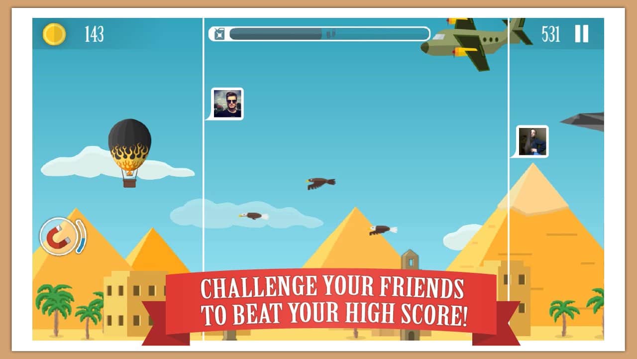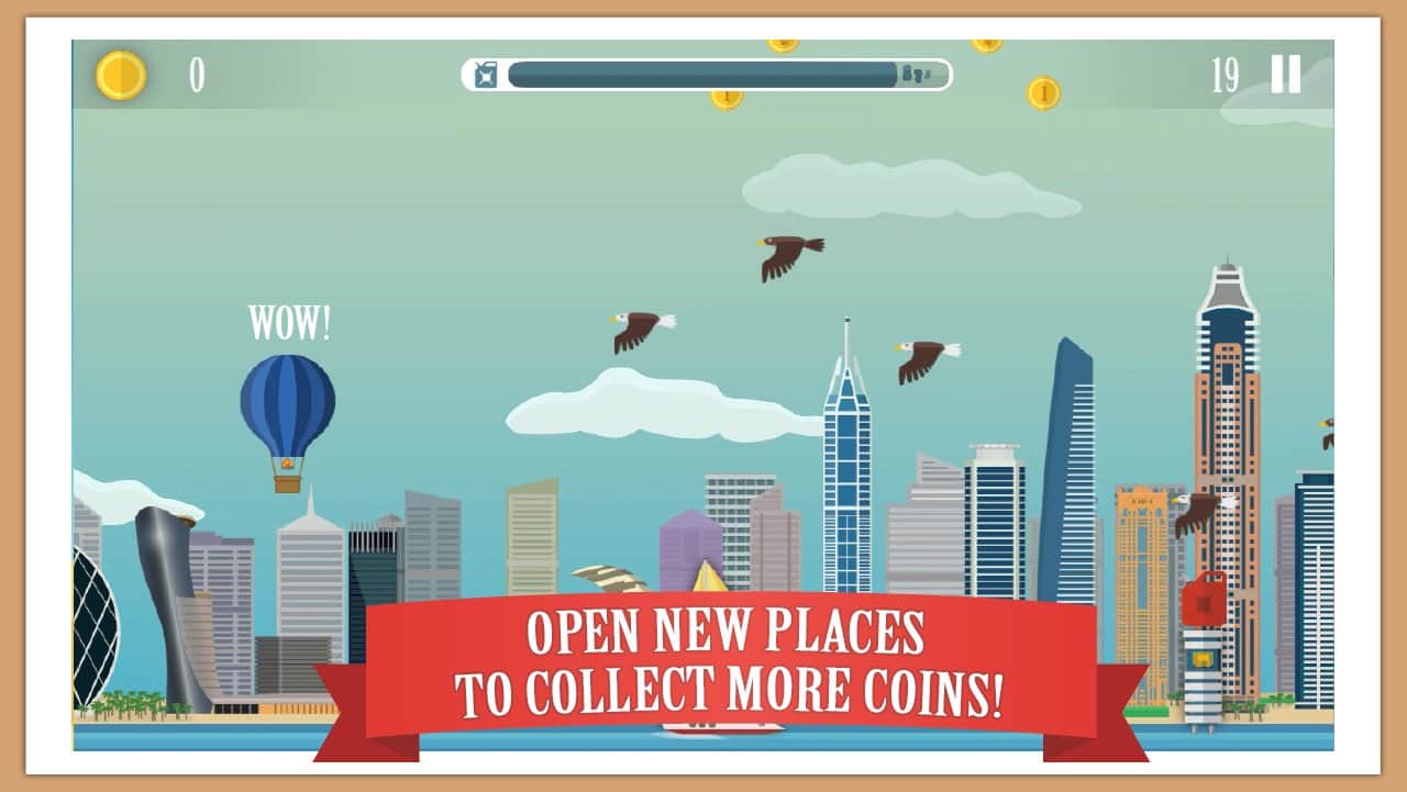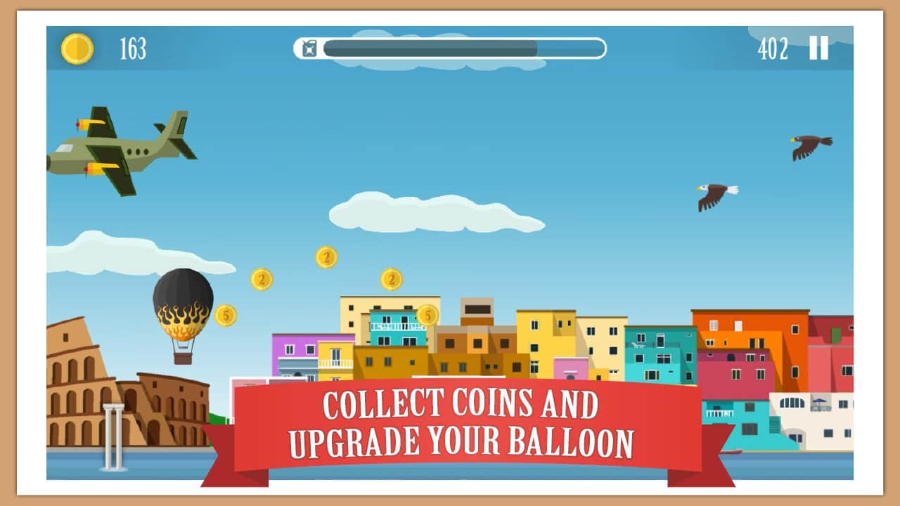 Crazy Air Travel – захоплююча аркада для андроїд, де ви будете керувати польотом повітряного кулі. У цій грі вашим завданням буде літати над різними локаціями і уникати зіткнень з численними перешкодами і перешкодами на шляху. Керуйте польотом кулі і збирайте по шляху численні монетки, бонуси і посилення. Виконуйте всі місії ігри і намагайтеся заробити якомога більше очок і піднятися на самий верх таблиці лідерів. Пройдіть більше 90 рівнів гри і відкрийте для себе всі повітряні кулі, представлені в грі. Прокачуйте силу польоту, ємність бензобака, отримуйте щити, збирайте магніти і монетки.