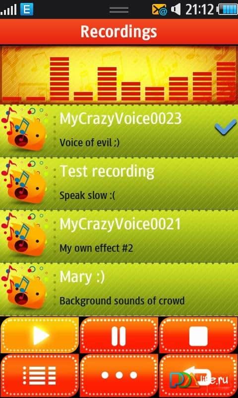 Crazy Voice 2 & amp;ndash; кумедна ппрограма для Bada. Програма трансформує ваш записаний голос. Вона може прискорити його або уповільнити, може змусити звучати його як дитячий лепет або як голос літньої людини. За допомогою функцій Програми Ви зможете самостійно вибрати для вашого голосу тембр, створити відлуння і т.д. А потім поділитися тим, що вийшло, з друзями.