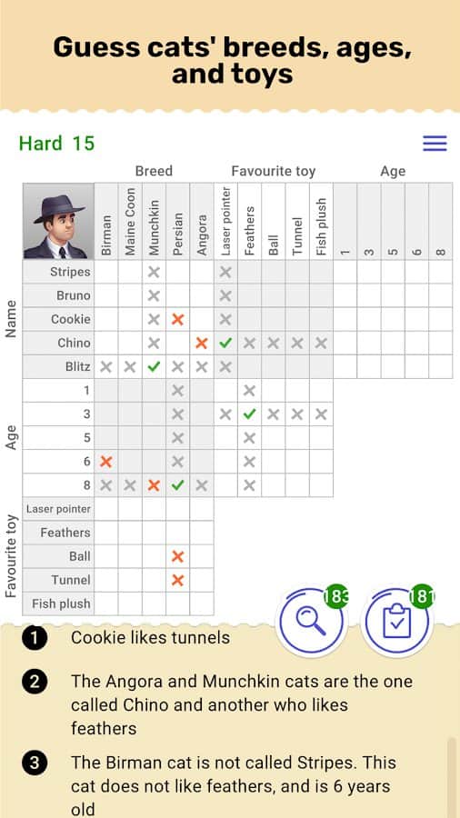 Логіка змушує ваш мозок працювати на максимумі, щоб у майбутньому було набагато легше знаходити приховані вказівки та вирішувати цілі головоломки, які для інших стають непосильними через високий рівень складності. Використовуйте всі знайдені ключі для пошуку розгадки, проходьте рівні та вдосконалюйте свій розум з кожним разом, успішно перемагаючи в іграх. Дотримуйтесь наданих вказівок у сюжеті кожної головоломки та будьте готові до непосильних завдань, до яких необхідно підготуватися та ретельно обдумати всі шляхи розв'язання.