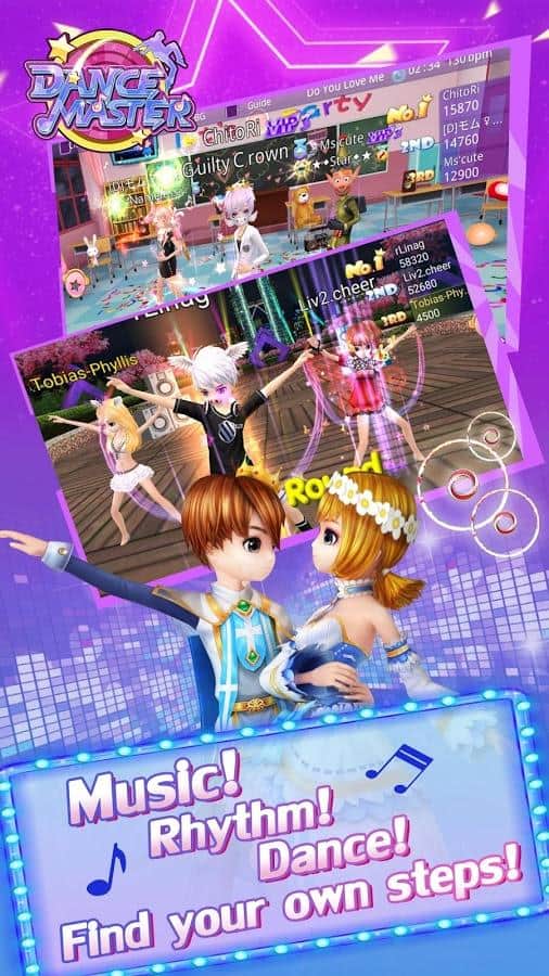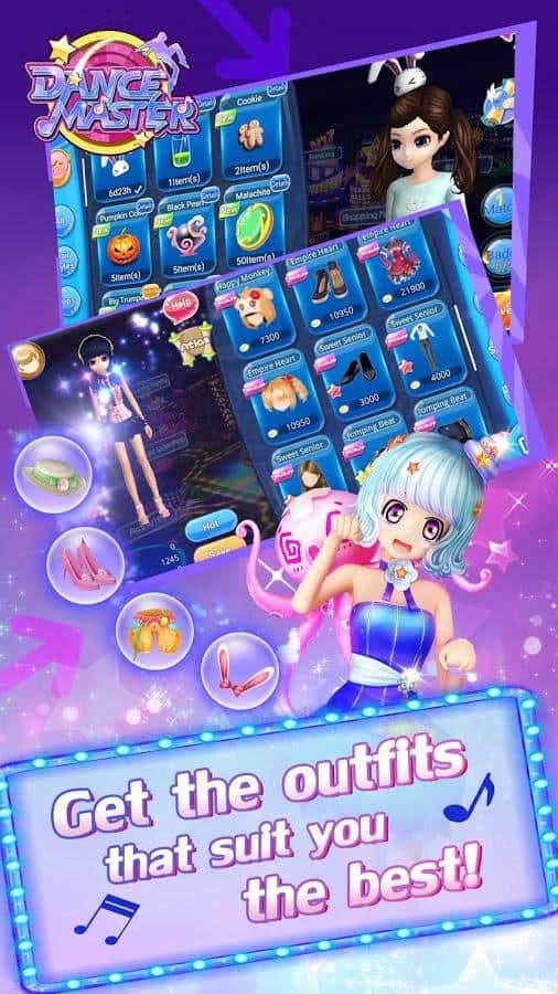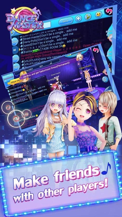 Dance Master – захоплююча музична гра на андроїд, створена в стилі аніме. У цій грі ви зможете вибрати собі персонажа з представлених в грі та одягнути її на свій розсуд. Починайте грати в цю гру і рухайте в ритм музики, виконуючи різноманітні танцювальні рухи. Танцюйте зі своїми фантастичними друзями і разом весело проводите час. Вашої головним завданням буде танцювати під мінливу музику і набирати максимальну кількість очок, потрапляючи в такт. Одягайте своїх героїв в різних стилях і отримуйте максимум задоволення від гри. Спілкуйтеся з іншими гравцями в загальному чаті і вигадуйте нові танці.