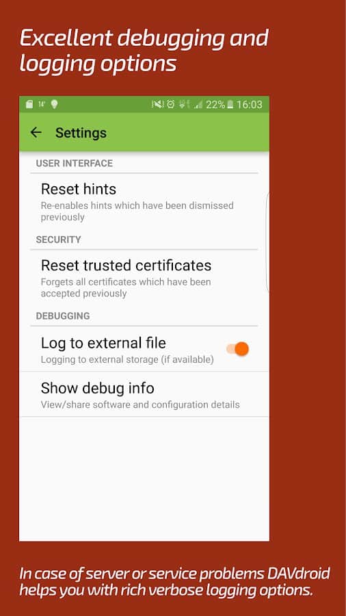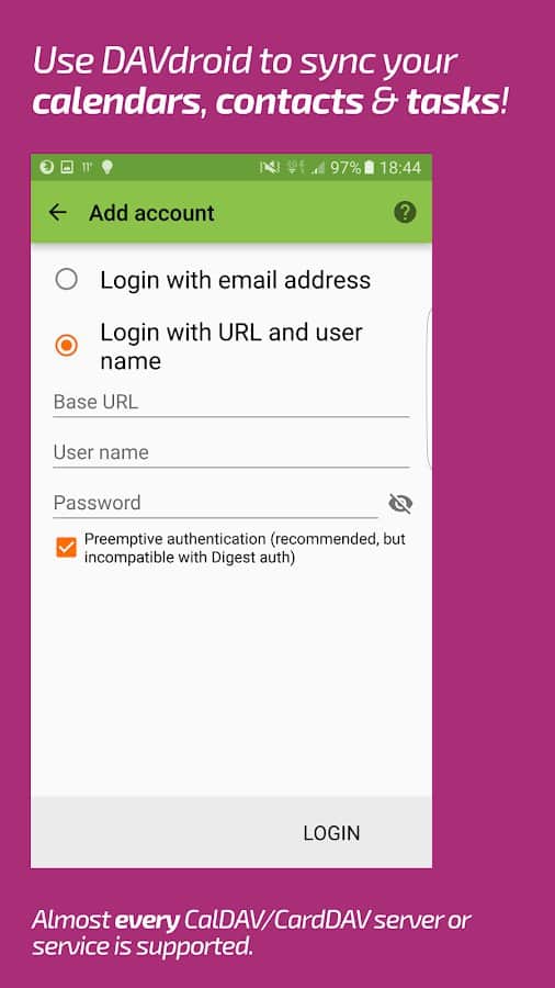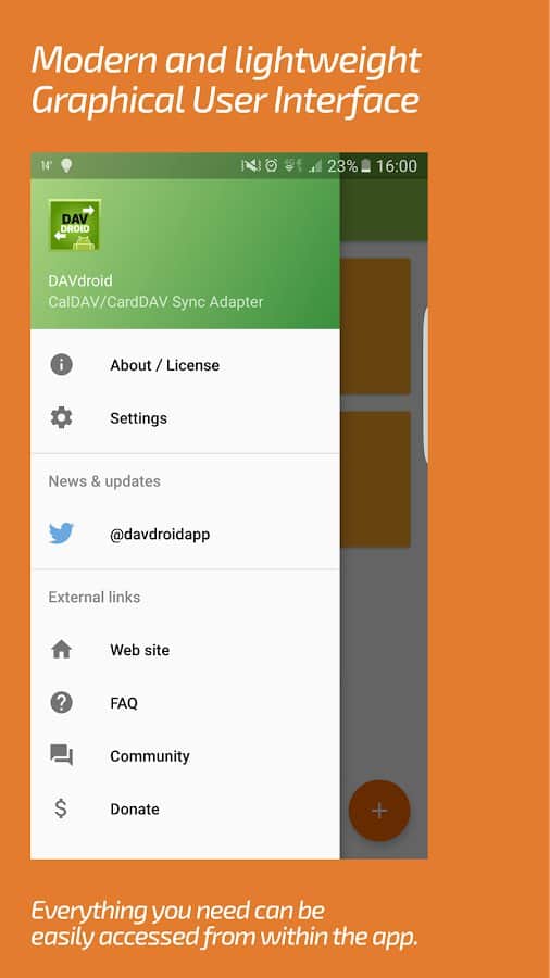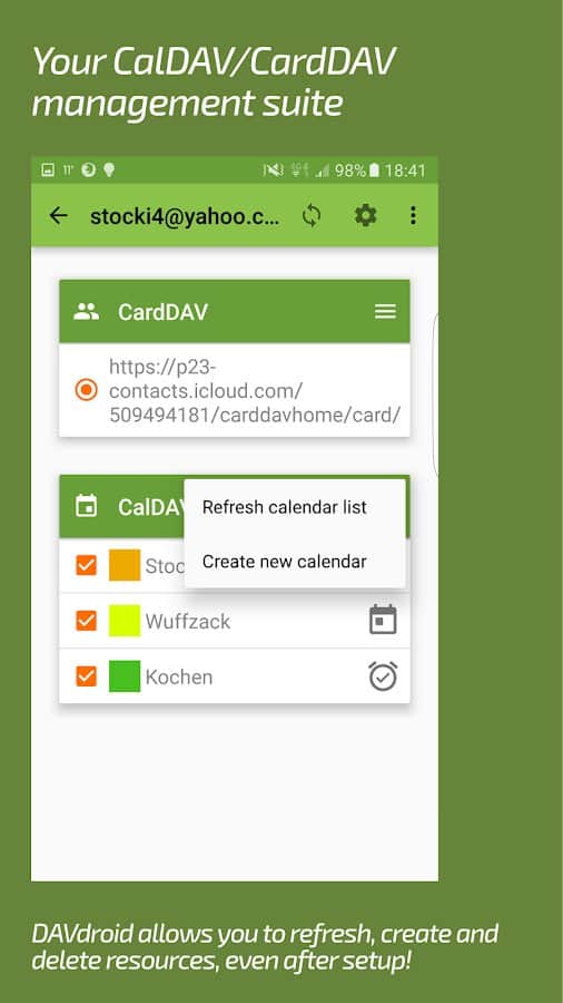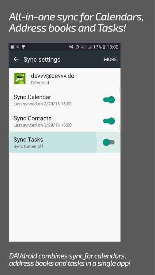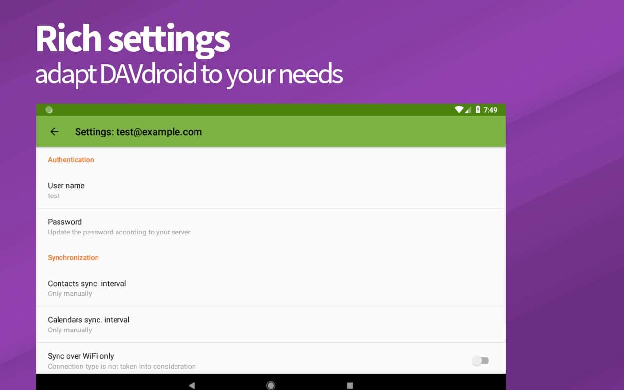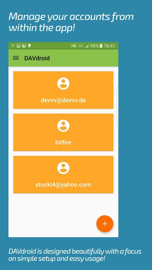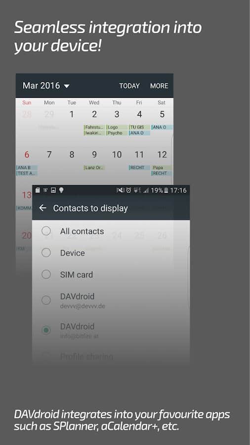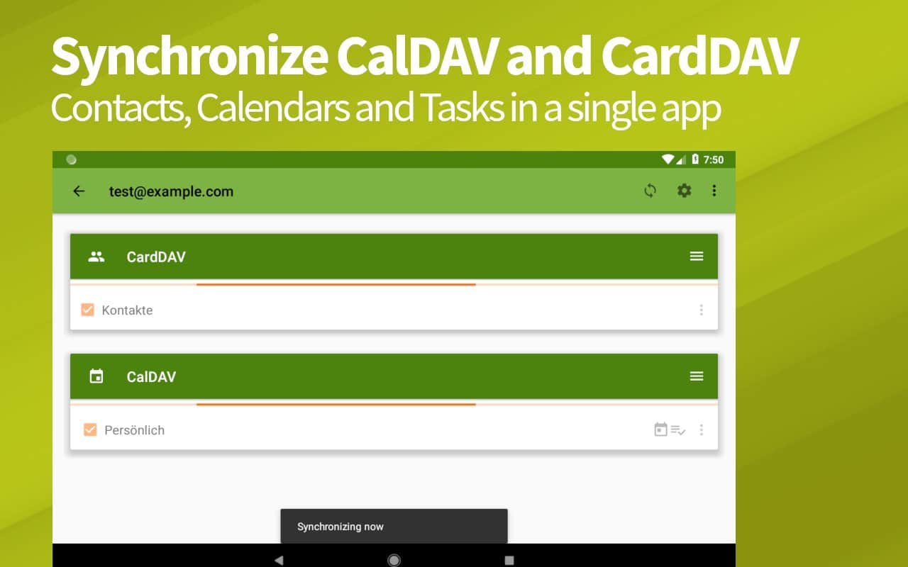 DAVx⁵ (DAVdroid) – CalDAV/CardDAV Synchronization - зручний, функціональний і просте додаток яке дозволить вам синхронізувати не лише контакти і заплановані справи, але і самі програми, які відповідають за календарі, планування завдань і багато іншого. Окремо варто відзначити що даний проект працює без підключення до мережі, так і з більшістю онлайн сервісів і ресурсів. Синхронізація з іншими сторонніми додатками так само труднощів не викличе.