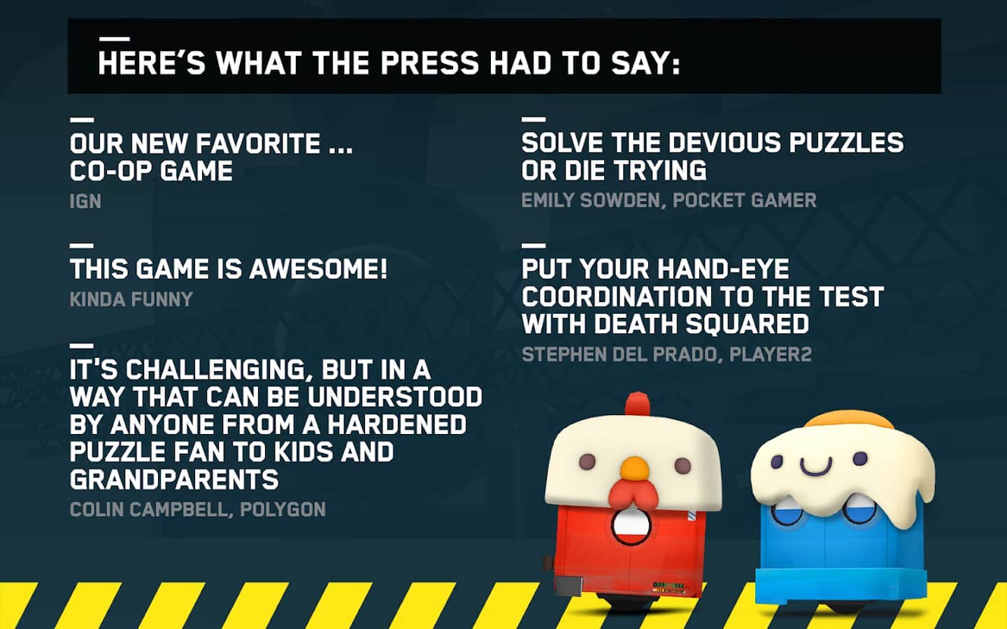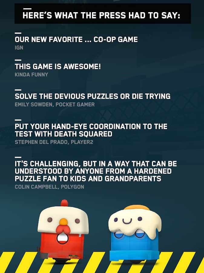 Death Squared – динамічна гра головоломка на андроїд, в яку ви зможете грати з друзями або самостійно керуючи одночасно декількома героями. У цій грі вашою головною задачею буде переміщатися по заплутаних лабіринтами і застосовувати унікальні здібності героїв, щоб пройти ті чи інші випробування. Покладіться на свою координацію і швидкість пальців і проведіть через всі випробування відважних героїв. Переміщайтеся з одного лабіринту на інший, складність яких буде поступово збільшуватися. У грі представлено 80 неповторних рівнів, оригінальний саундтрек і шапочки для персонажів.