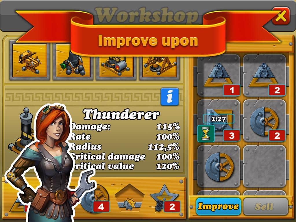 Defense Of Greece – красочная стратегия на андроид, которая перенесет вас во времена Древней Греции, период паровых машин и механических роботов. В этой игре вы станете полководцем, которому предстоит пройти нелегкий путь, начиная от юнца новобранца, и дойди самых верхов стать генералом. Разрабатывайте свою стратегию, сооружайте новое оружие по защите крепости и отбивайтесь от различных видов противников, начиная от пехотинцев и заканчивая роботами и летательными аппаратами. Сложность в этой игре постоянно будет увеличиваться и вам все серьезнее придется подходить к игре, улучшая пушки, оружие, заменять детали в машинах, увеличивая их производительность и проходить увлекательные квесты.
