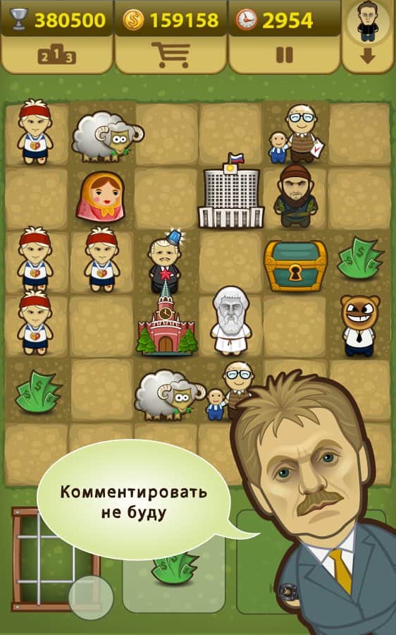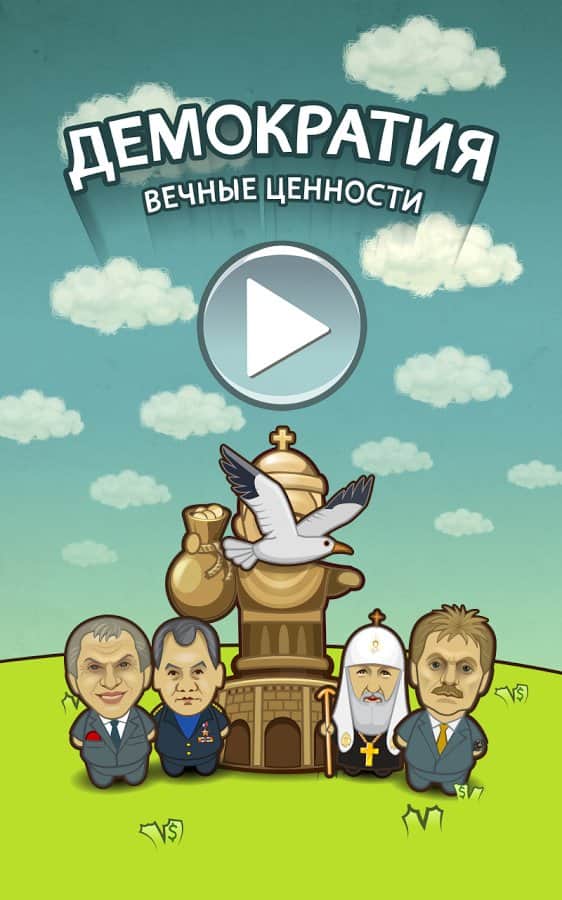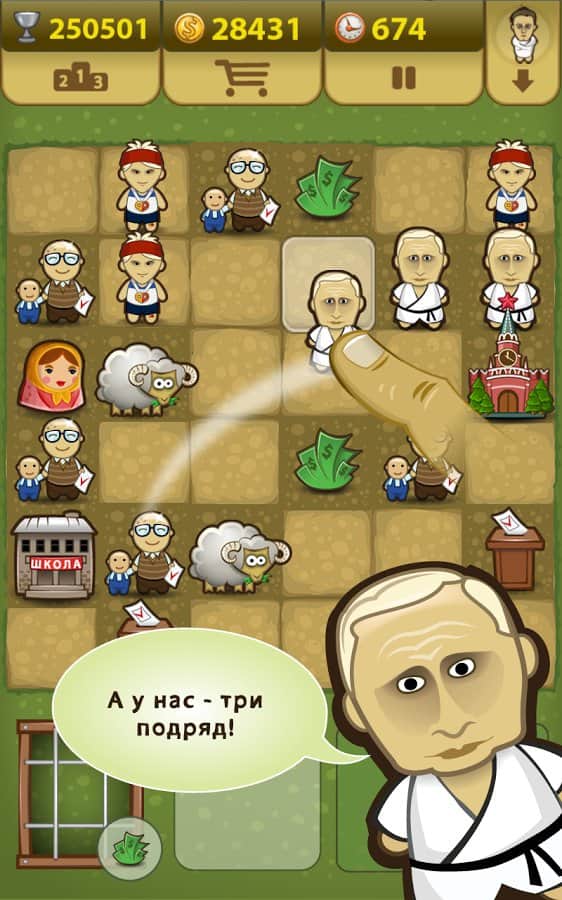 гра демократія - кумедна і дотепна головоломка для Андроїд - про політичне життя країни. Суть гри-збирати три однакові фігури і трансформувати їх в більш значущу. Далі три більш значущі-в ще більш авторитетну, і т.д. за цим принципом. Але не все так просто і банально! У грі особлива атмосфера і все продумано до дрібниць: спочатку збираєш стадо овець з пучків трави, перетворюєш їх в виборців (такий собі пенсіонер з лисинкою), виборців — в школи, школи — в дільниці для голосування, ну а ті, в свою чергу, перетворюються в народних депутатів. Три депутати-Дума, три Думи-прем'єр. І так можна дособіраться до царя. І ось розумієте, що гра чертовски складна. Постійно звідки не візьмись з'являються погрози у вигляді полковника КДБ, генерала або настирливих агітаторів. Тому потрібно уважно продумувати ходи і заздалегідь розташовувати в розумі все фігурки, щоб дуже раціонально використовувати клітини. Але є і помічники, так би мовити. Це пила і бабло. Пиляти можна і шкідливих і непотрібних персонажів, а баблом заповнювати потрібні фігурки. А для того, щоб зберегти фігурку про запас, її можна помістити у в'язницю. Погодьтеся, що можливість буквально посадити за грати деяких політичних діячів-вельми приваблива пропозиція? < br />