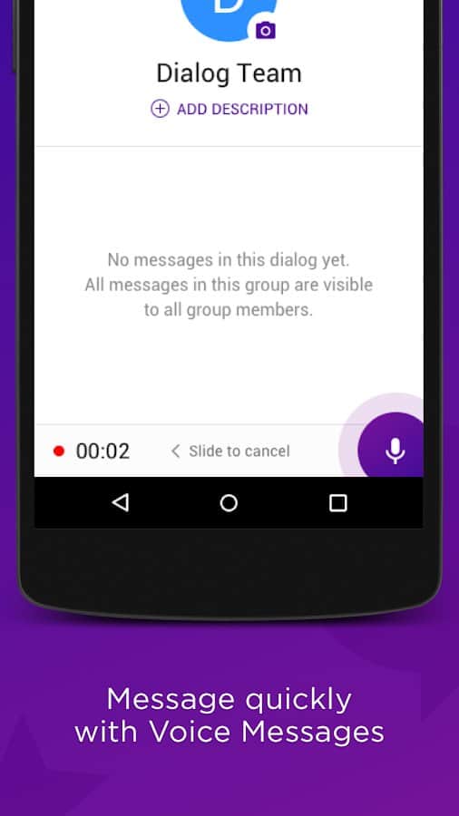 Dialog Messenger призначається для створення групових і одиночних чатів в межах однієї фірми або організації. Користувачам доступний повний перелік функцій стандартного месенджера. Можна не тільки листуватися один з одним в текстовому режимі, але й відправляти голосові і відео-повідомлення, а також обмінюватися різними файлами. Ви можете встановити месенджер на один з серверів вашої організації, щоб бути впевненим, що вся інформація буде надійно захищена, прихована від сторонніх очей.