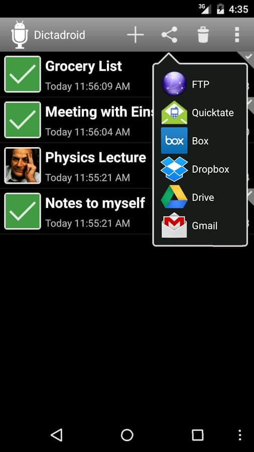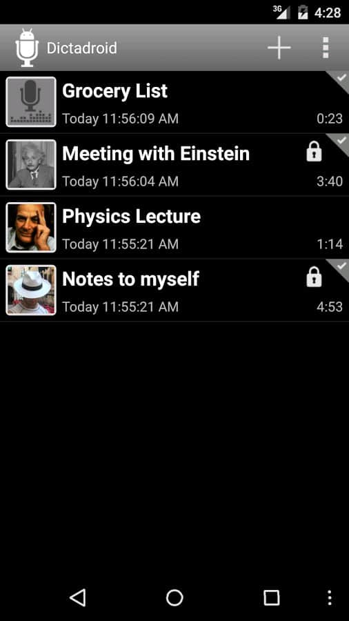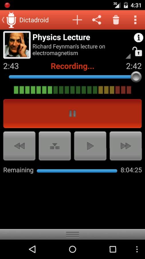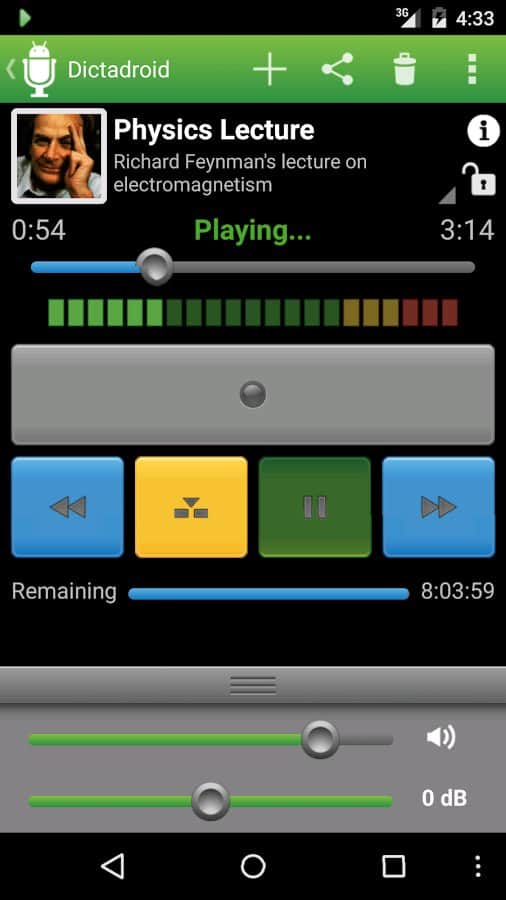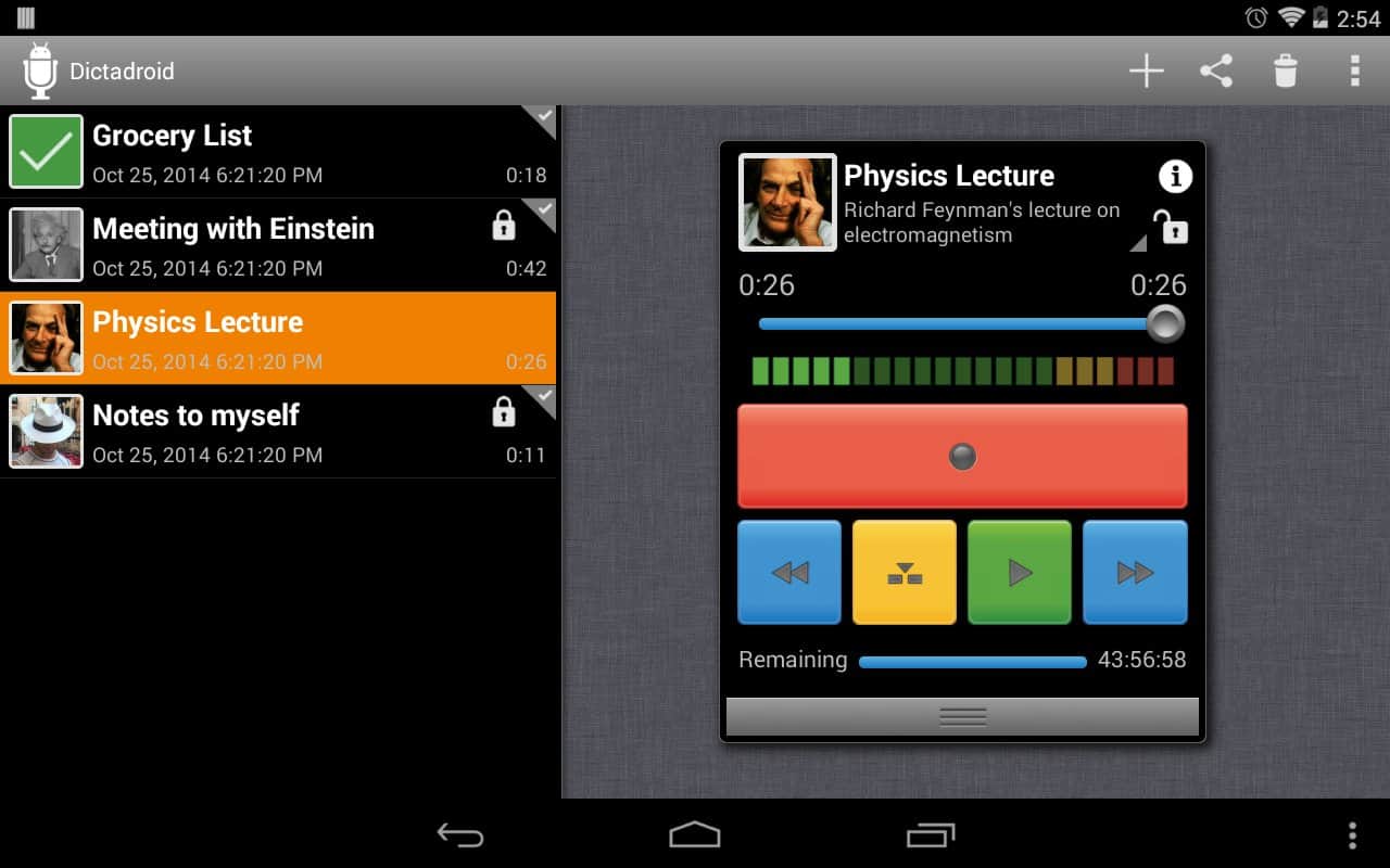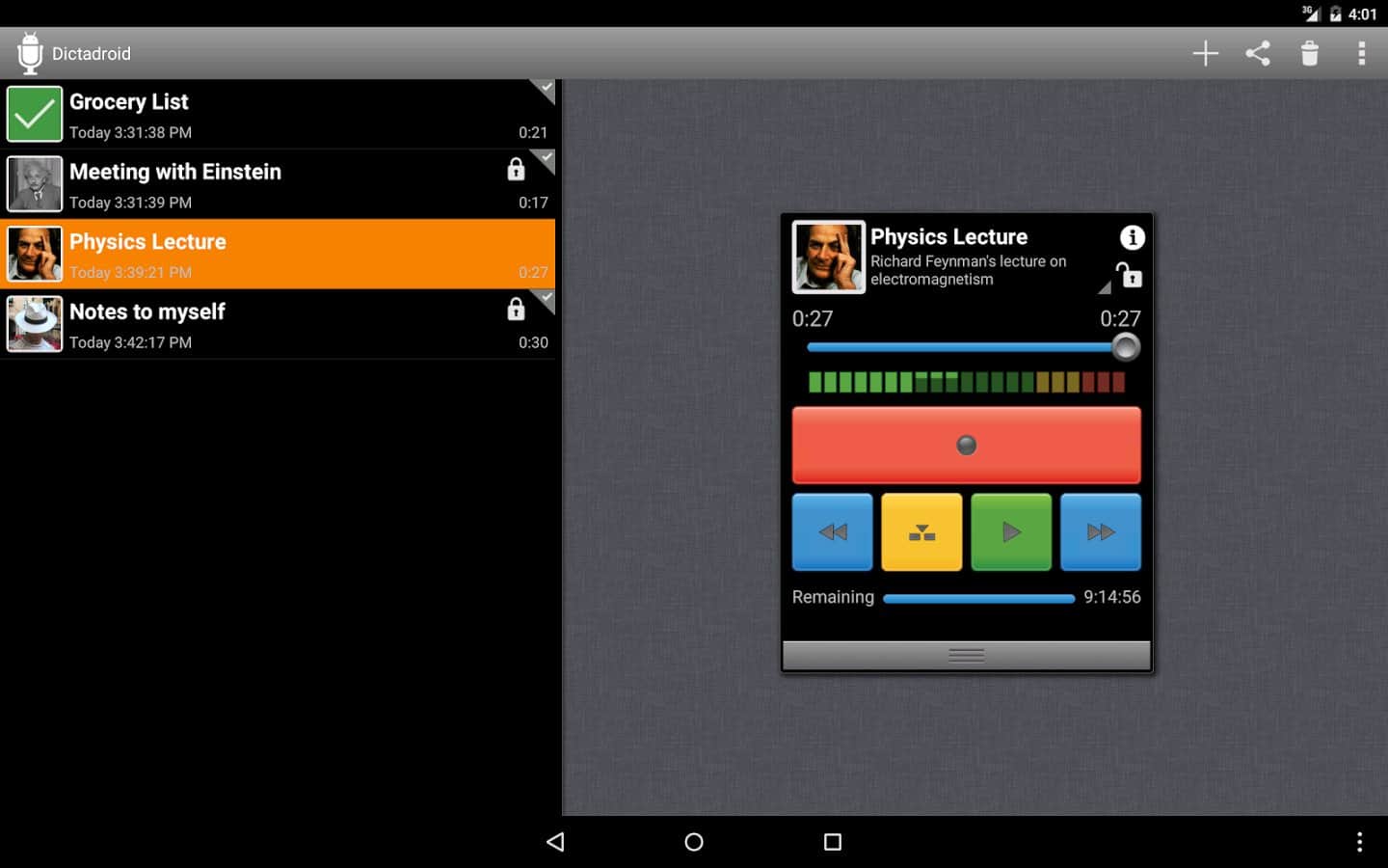 Dictadroid Voice Recorder - за допомогою цієї програми ви зможете використовувати свій пристрій як професійний диктофон. Записуйте лекції, важливі зустрічі та робочі моменти, музику та будь-які інші звуки. Діліться записами електронної пошти, MMS, FTP, Google Drive або Dropbox. Основні можливості: