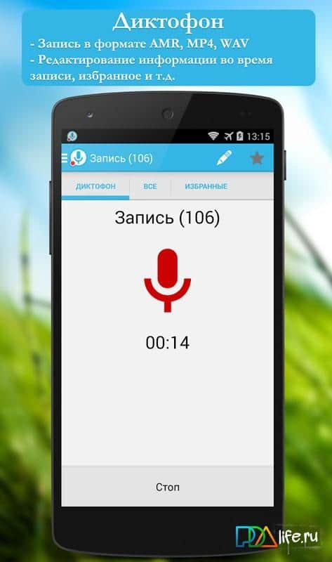 Диктофон – зручний диктофон, в основні можливості якого входять: створення запису у форматі mp4, wav, amr, а так само створення мітки часу. Записуйте всю необхідну інформацію на свій пристрій за допомогою цього додатка, тоді ні одна важлива деталь розмови або доручення не залишиться не поміченою.