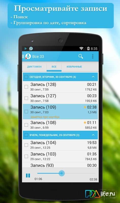 Перегляд записів: групи (усі / вибрані), сортування (за датою, за тривалістю, за розміром файлу, групування записів по днях, пошук по всім записам.