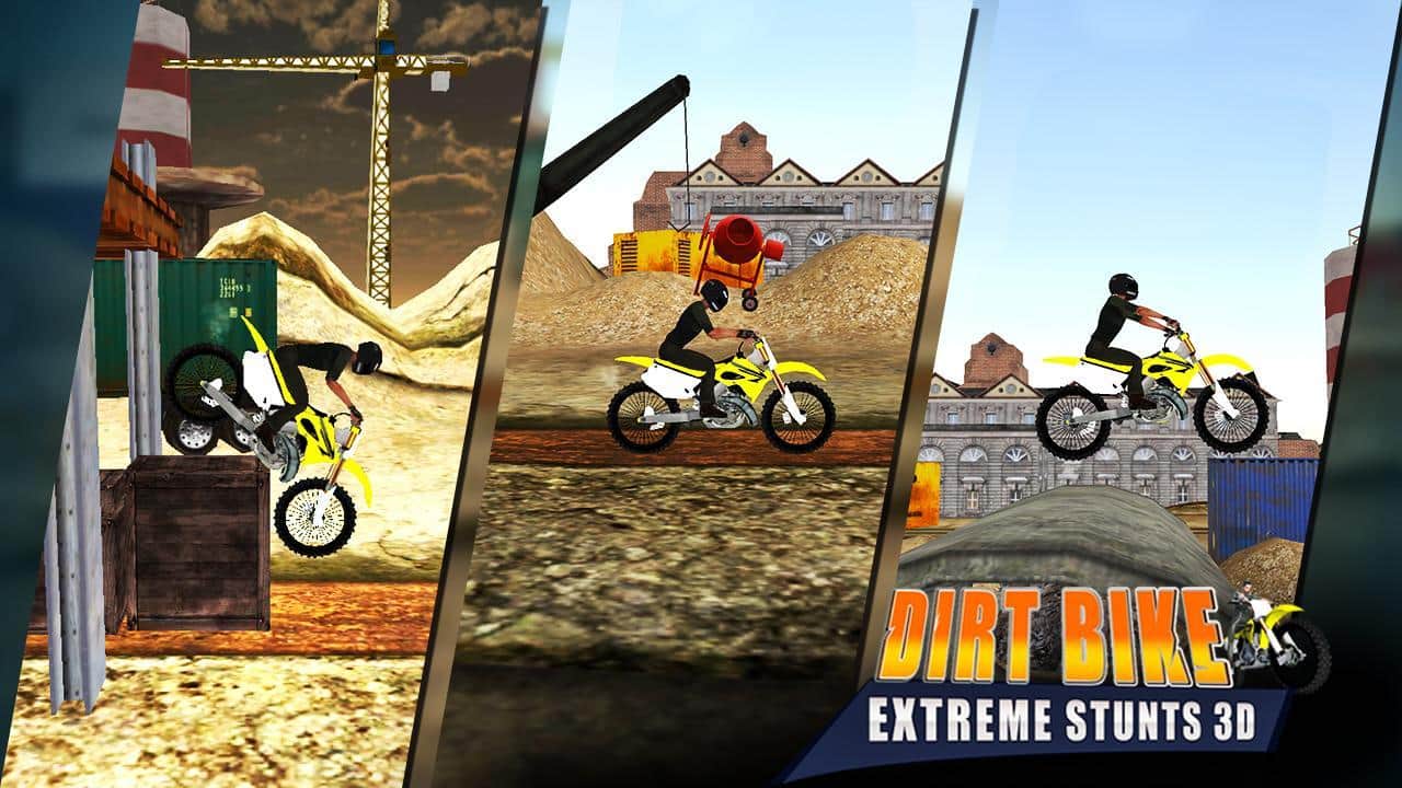 Dirt Bike : Extreme Stunts 3D – гонки на андроїд, де ви візьмете під свій контроль відважного мотоцикліста який буде ганяти по небезпечних трасах. Прийміть свою безпосередню участь в екстремальних гонках по бездоріжжю в цій грі. Ганяйте на величезній швидкості і ведіть свій мотоцикл вперед, долаючи глибокі ями, круті схили, перешкоди і круті підйоми. Виконуйте неймовірні трюки, сальто і перевороти при цьому вчасно натискаючи на педалі газу і гальма. Дістаньтеся до фінішу цілим і неушкодженим і не розбийте свій мотоцикл по дорозі. Гра порадує вас реалістичною фізикою, різноманітними мотоциклами і зручним управлінням.