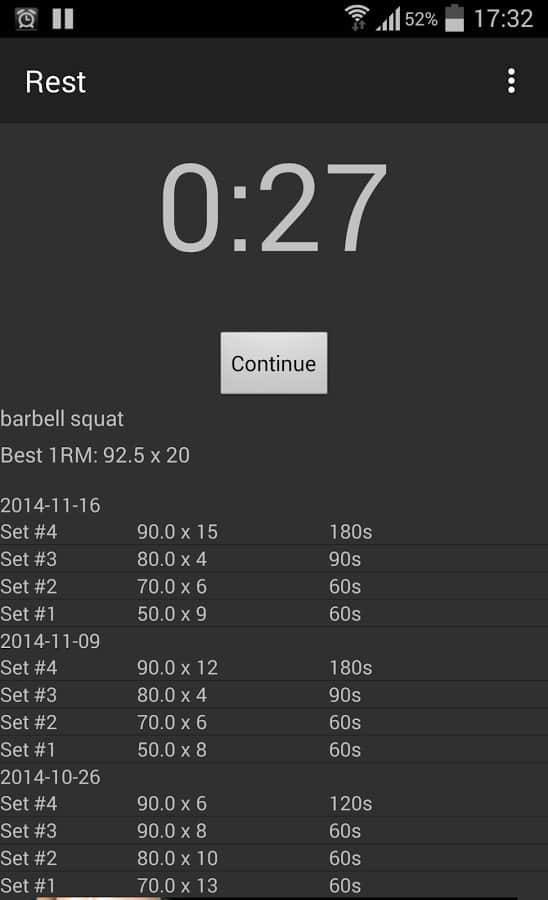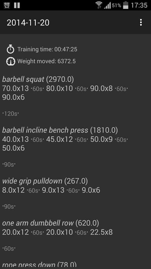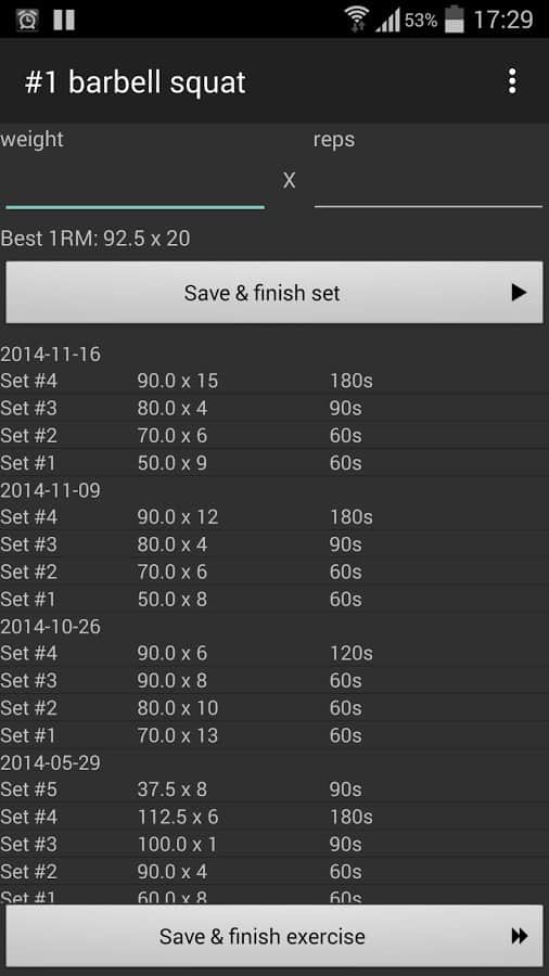 - Все время отображаемая история подходов, повторений, весов и времени отдыха;