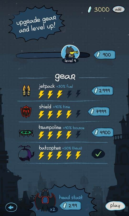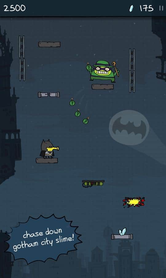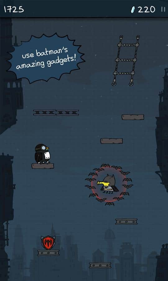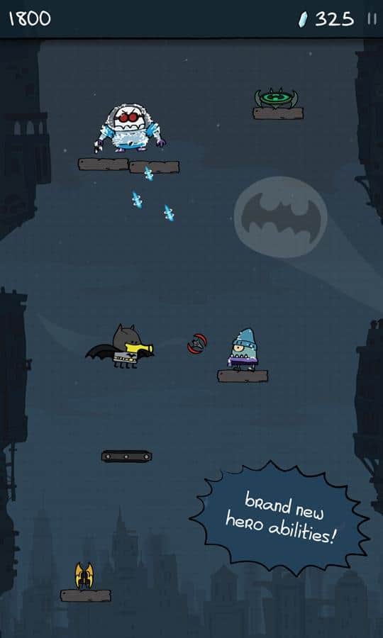 Doodle Jump DC – игра в которой вы будете управлять супергероем Бэтменом. Прыгайте все выше по платформам и старайтесь добраться до главных злодеев Готэма – Пингвина, Мистера Фриза, Джокера и The Riddler. Все злодеи Готэма собрались воедино и украли мощный кристалл, который может уничтожить весь город. Вашей задачей будет догнать их и уничтожить с помощью мощного оружия и снаряжения. Управляйте своим героем с помощью одного нажатия на экран и собирайте монетки и бонусы, которые помогут вам быстрее справиться со злодеями. Бросьте вызов своим врагам и покажите им, на что вы способны.