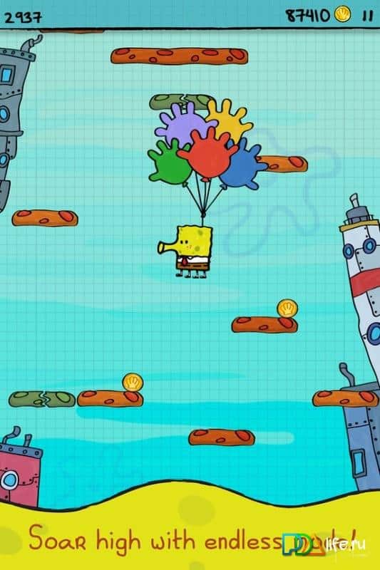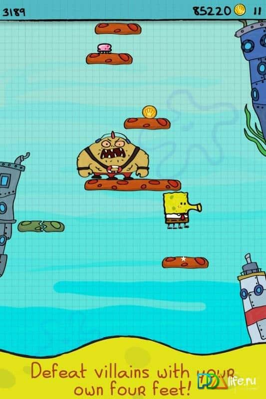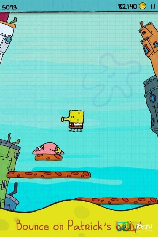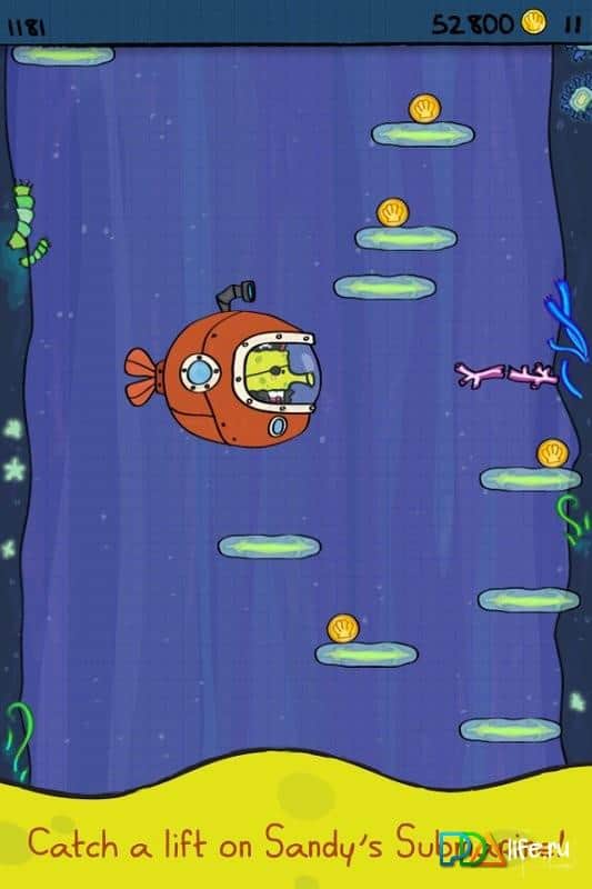 Doodle Jump SpongeBob-компанія Nickelodeon вирішила погратися з героями їхніх творів. Вона з'єднала героя гри Doodle Jump і Спанч Боба, і отримала дуже веселу стрибалку на Андроїд. Вам належить стрибати цим гібридним героєм вгору, використовуючи різні бонуси, такі як надувні кульки, або батискаф. Дії гри в основному відбуваються під водою, тому приготуйтеся до підводних монстрів, і інших небезпек.