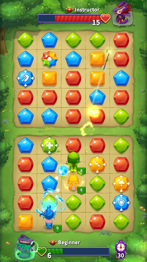 Duel Summoners - Покличте фантастичних героїв, добре граючи у міні-гру «Три в ряд»! Чим менше ходів зроблено до досягнення мети і чим більше досвіду ви отримуєте, тим краще перемога і винагорода. Герої призиваються, коли в ряд збудовано 3 однакових кольору коштовностей, але щоб побачити дуже сильних, зберіть якомога більше квітів. Роль кожного персонажа із зібраної колекції також важлива, адже з його допомогою навичок можна знищити цілу дошку. Кидайте виклик іншим гравцям цього світу і бийтеся в реальному часі!