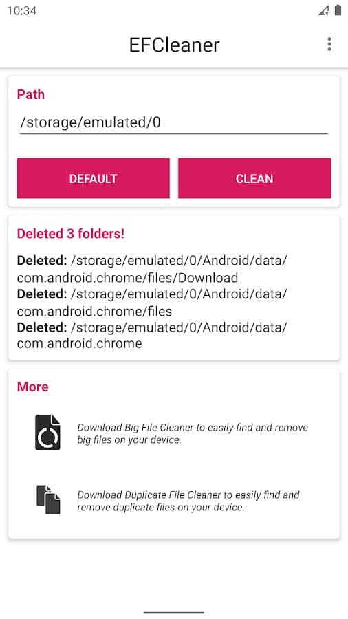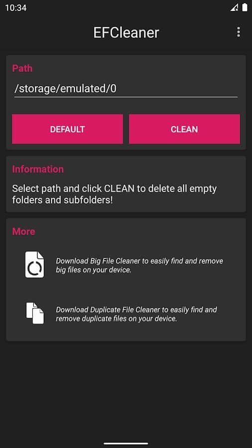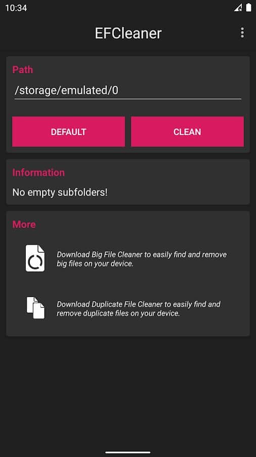 Empty Folder Cleaner - Clean your device повністю видаляє порожні і вкладені в них папки на смартфоні. Можна вибрати потрібну вам папку в ручному режимі або за замовчуванням утилізувати все.