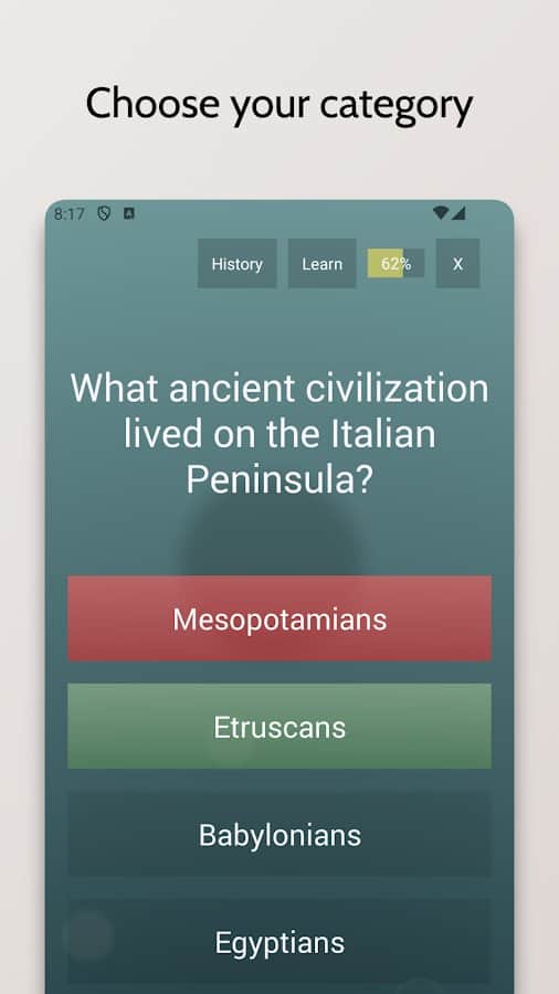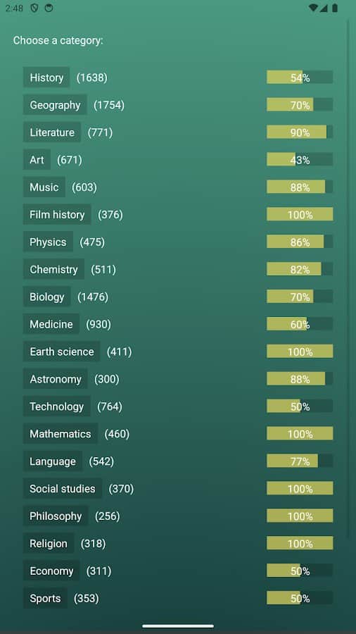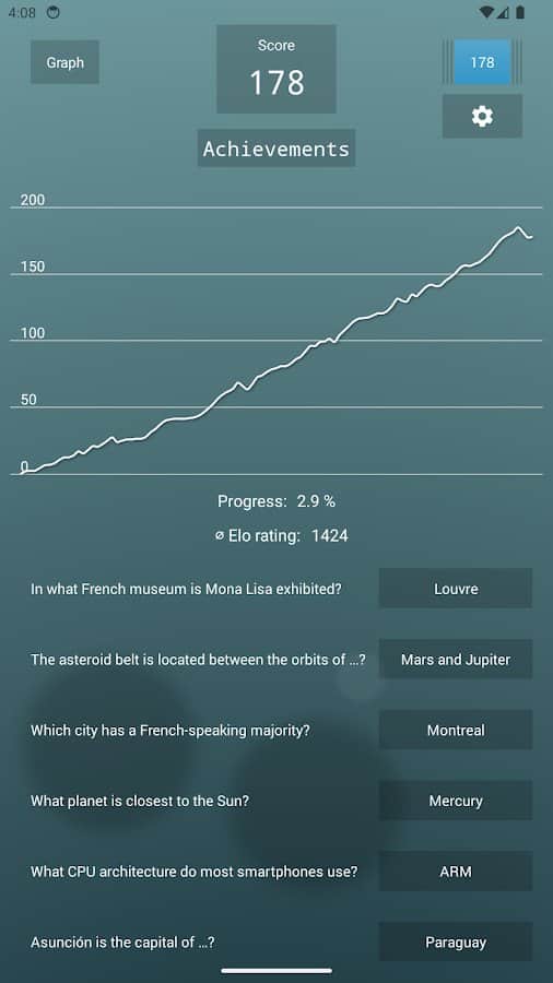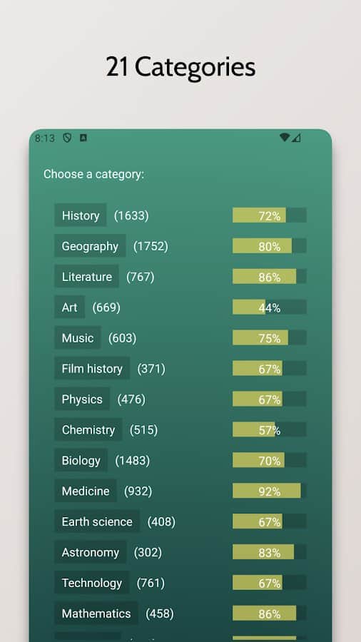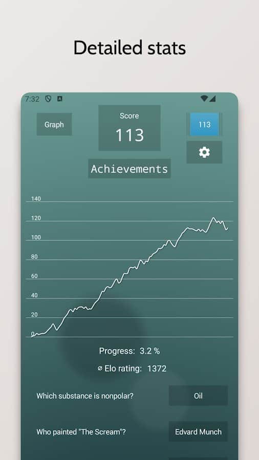 Цей вікторина пропонує безкінечний потік питань для перевірки вашої ерудиції. Кожне питання було ретельно відібране й створене для перевірки різноманітних аспектів загальних знань. Усі питання пов'язані з Вікіпедією, тому після відповіді ви можете дізнатися щось нове. Ви можете відстежувати свій прогрес за допомогою рейтингу Ело й порівнювати свої результати з іншими гравцями. Якщо захочете, ви також можете перевірити свої знання в змаганнях з іншими учасниками. Крім того, ця гра доступна на Wear OS.