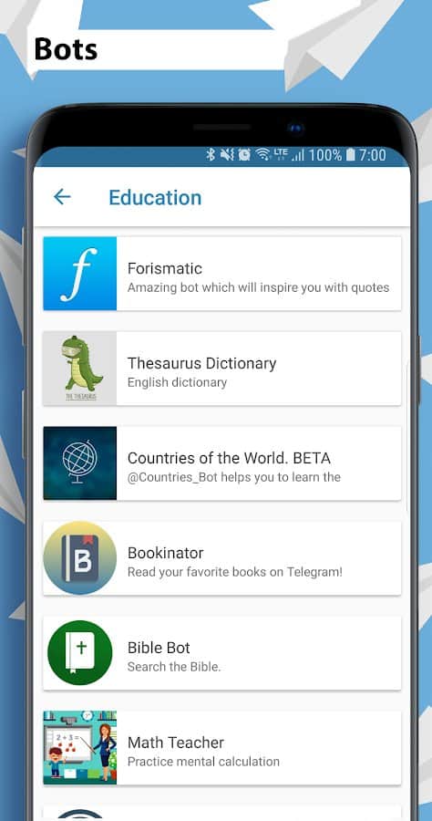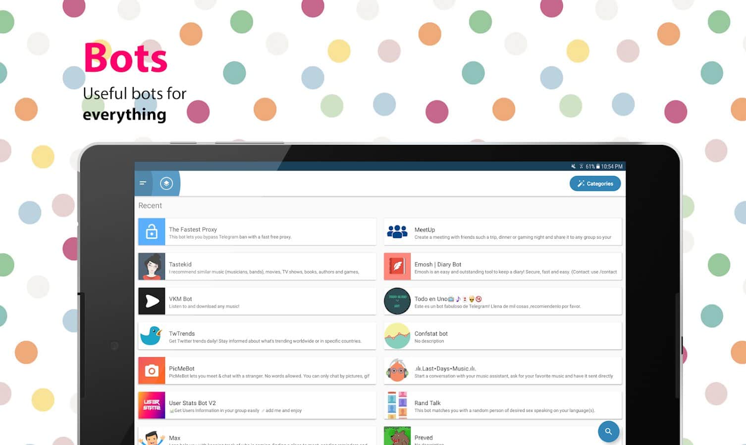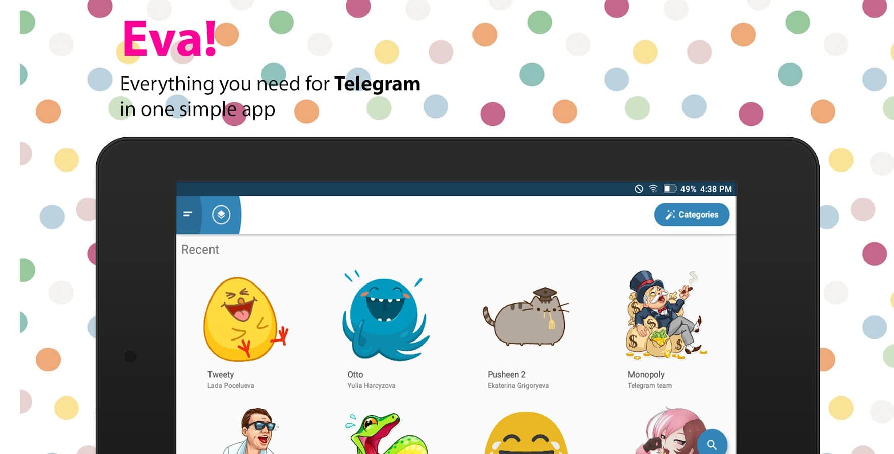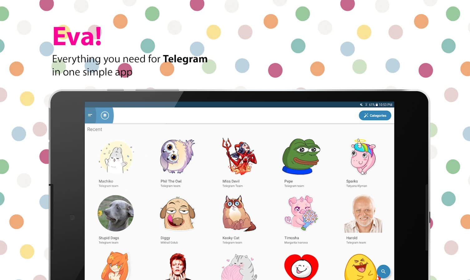 Eva: Everything for Telegram - Частенько бувало що ви не могли знайти щось потрібне і корисне для вашого telegram клієнта? Це додаток вирішить дану проблему, адже воно увібрало в себе набори для стікерів, безліч популярних груп, а так само цілу купу ботів. Встановити або налаштувати ботів стало простіше простого, всі вони мають опис і сортуються списком. Тут ви не знайдете нічого зайвого, тільки саме головне і необхідне.