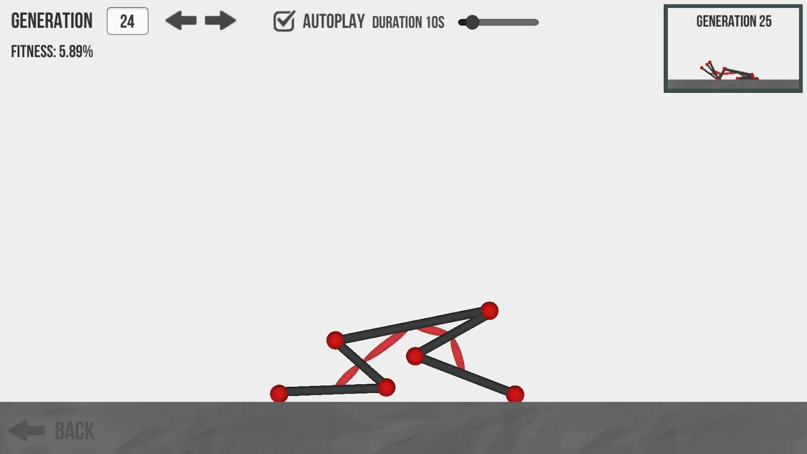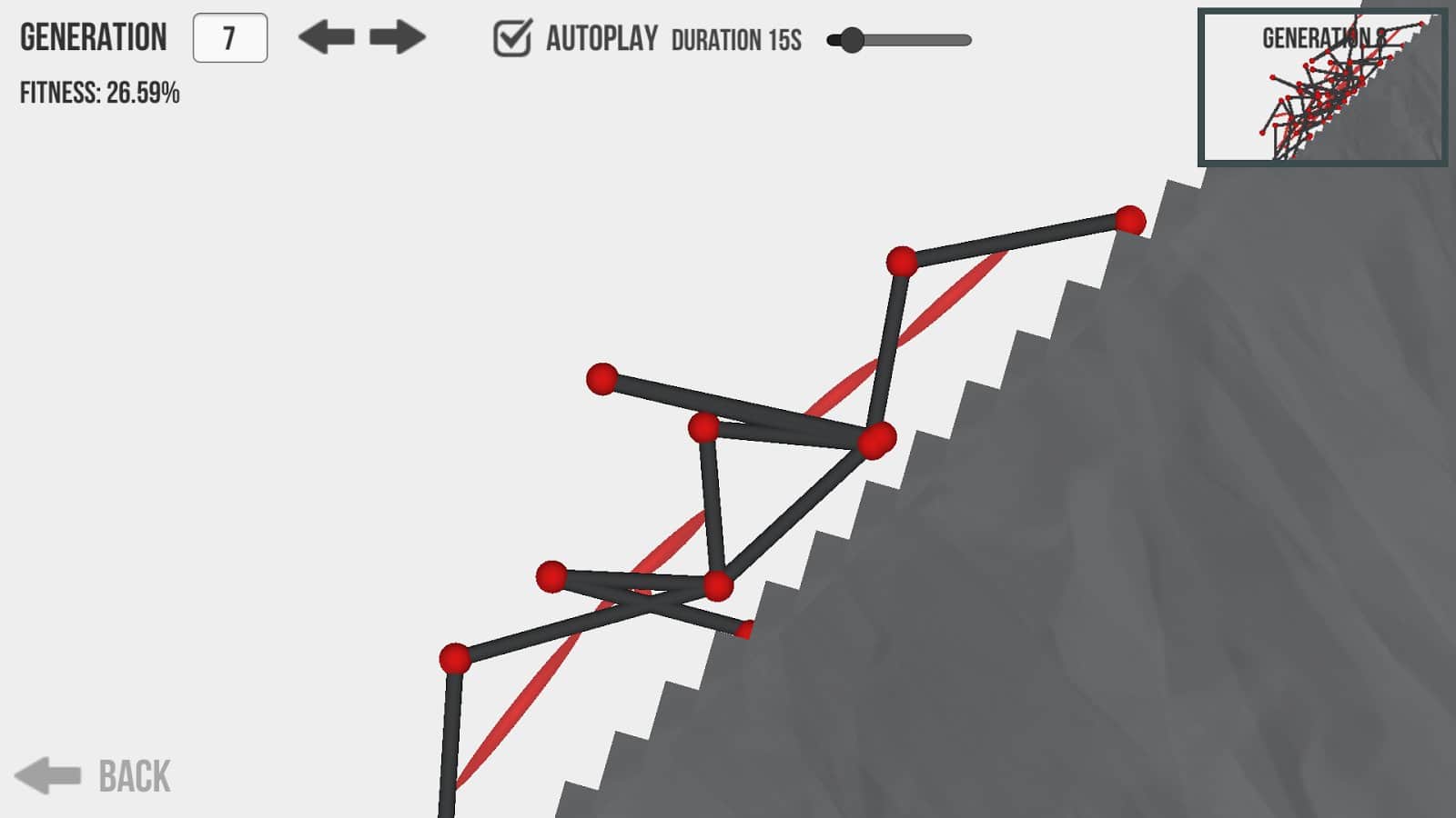 Evolution – захоплююча гра на андроїд, де ви будете створювати різні істоти поєднуючи для цього нейронні зв'язки і генетичні алгоритми. Використовуйте для створення неймовірних істот суглоби, кістки та м'язи і змушуйте своїх істот здійснювати стрибки, різні рухи і дертися на стіну. Підключайте свою безмежну фантазію і будуйте неймовірних істот, для того щоб виконувати поставлені завдання. Якщо ви зацікавлені в природному відборі, вирішенні поставлених задач та знаходження правильних рішень, то ця гра створена для вас. Грайте зі своїми друзями і показуйте їм своїх істот.
